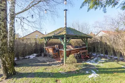 A 606 m²-es telken, rendezett ősfás kert, fedett sütögető és automata öntözőrendszer biztosítja a nyugodt és kényelmes természetközeli életet.