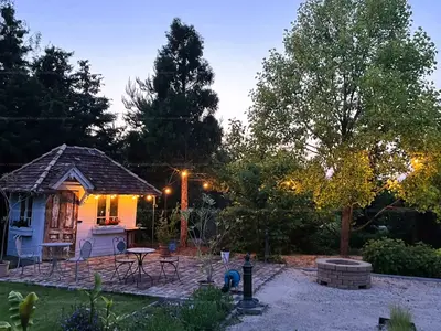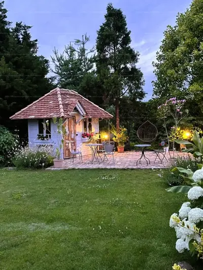 - sok éve karbantartott, egyedülálló stílusú gyönyörű kert dísznövényekkel, gyümölcsfákkal