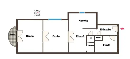 Helyiségek: tágas nappali, hálószoba, külön étkező, konyha és sarokkáddal felszerelt fürdőszoba, jól használható gardrób.