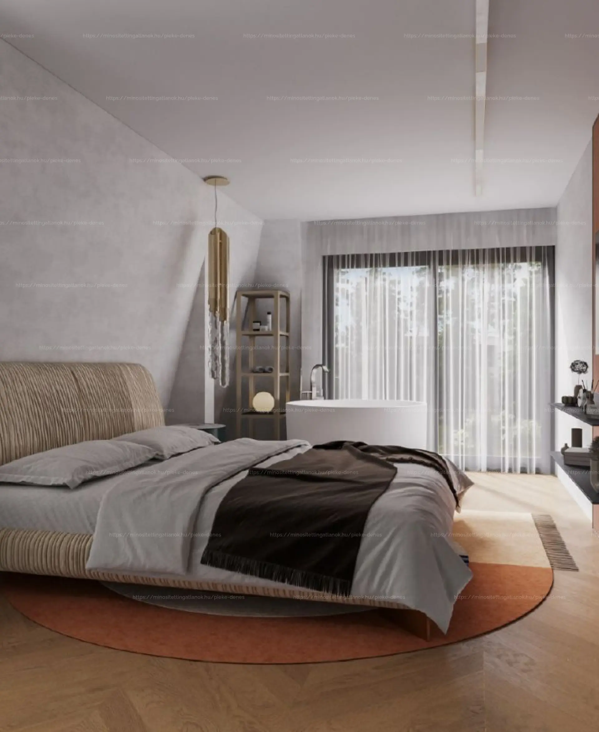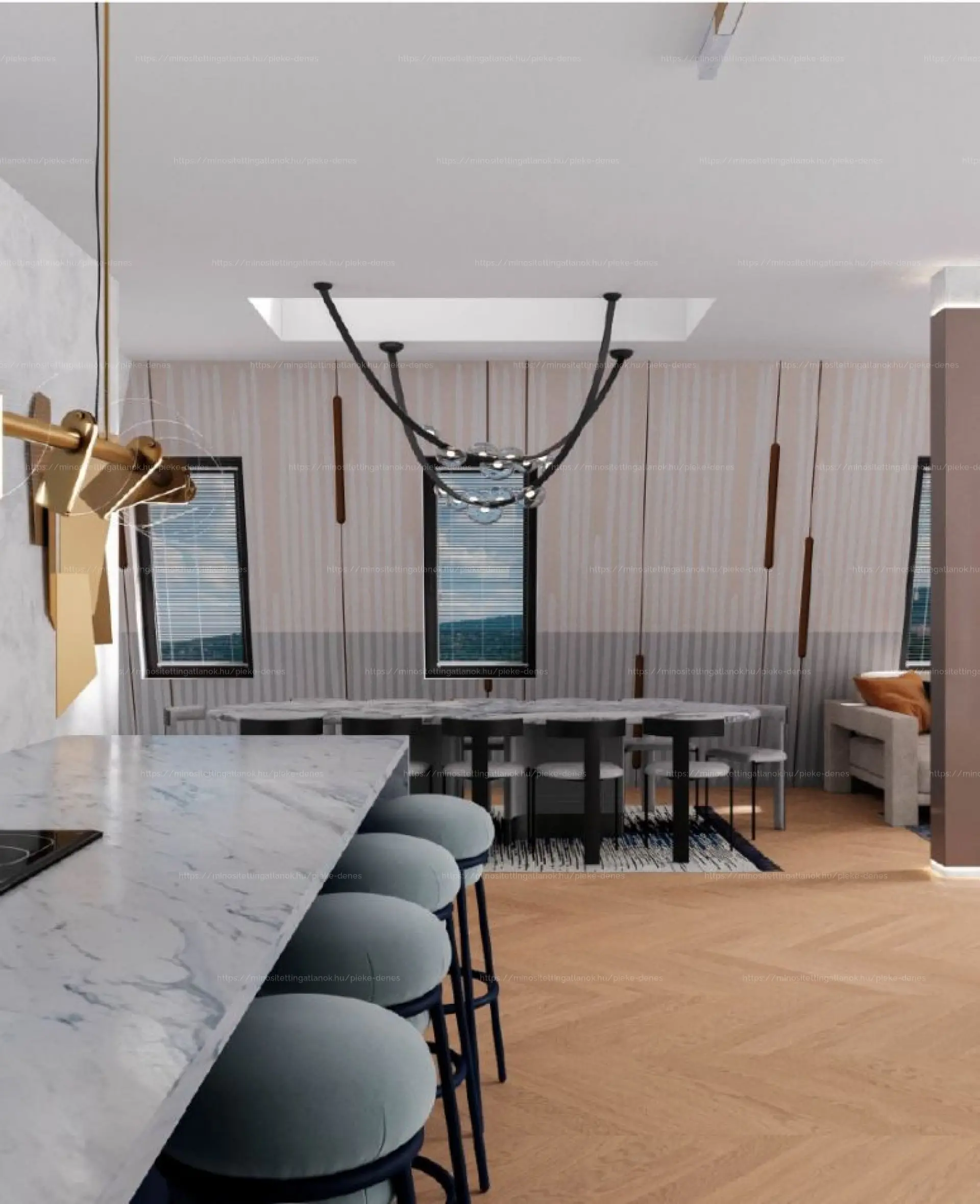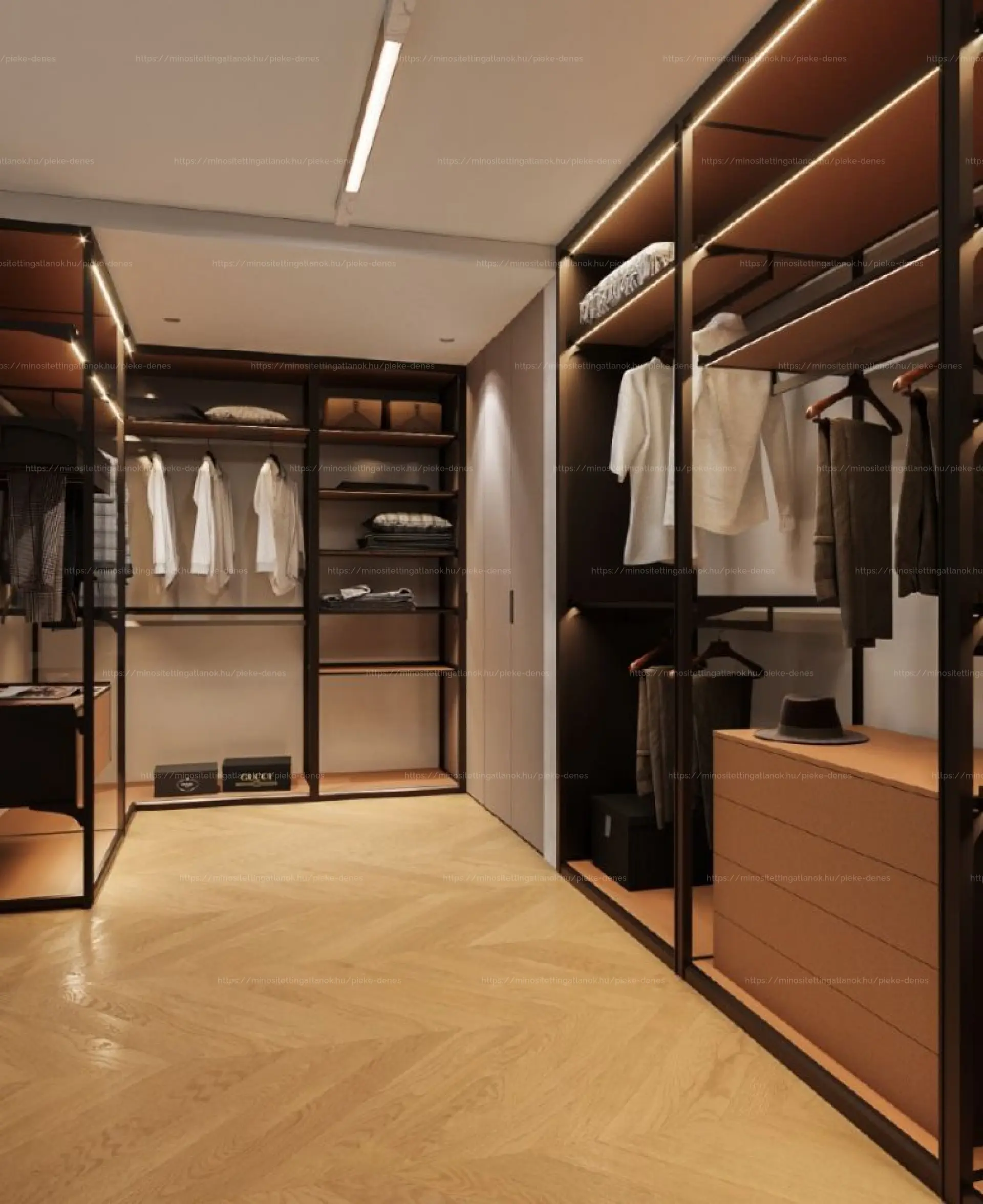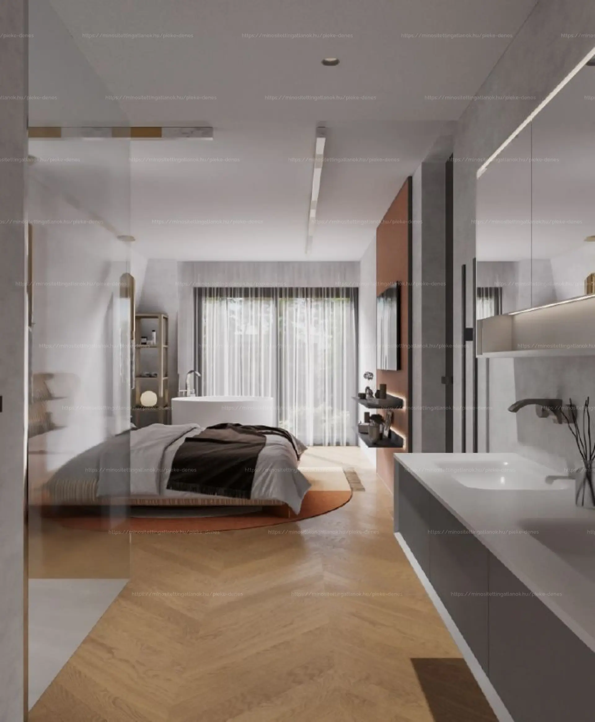A belső elrendezés a nagypolgári tágas tereket idézi: nappali-étkező-konyha egyben, több hálószoba, gardróbszoba, háztartási helyiség és három fürdőszoba. A belső lépcső elegánsan köti össze a két szintet, miközben funkcionálisan is tagolja a tereket.