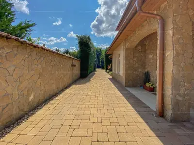 Az épület tégla falazata szigetelt, födémszerkezete monolit vasbeton. A nyílászárók hőszigetelt üvegezésűek, a beltéri ajtók anyaga tömör fa. A helyiségek légkondícionáltak, a ház riasztórendszerrel ellátott. A gondozott, automata rendszerrel öntözött kert szintén néhány éve lett felújítva. A növényzet kialakítása teljes privát szférát teremt a kertben tartózkodók számára. A garázshoz vezető térkő burkolat kifut a telek végéig, kényelmes parkolást biztosítva a vendégeknek. A 60 m3-es (12 méter hosszú) medence tisztaságáról vízgépészet gondoskodik, igény szerint fűthető. A házat L alakban kísérő tornácos terasz kellemes pihenőnek ad helyet.