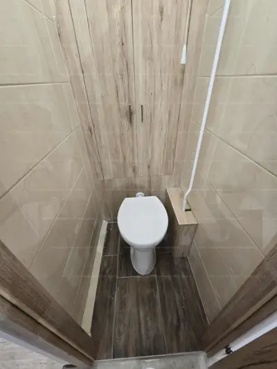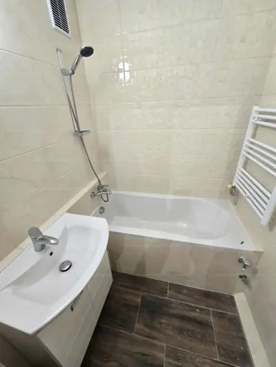 Kádas fürdőszoba hidegburkolattal, külön WC.