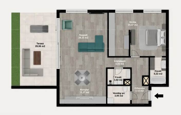 A 89 m²-es lakáshoz 29 m²-es dél-nyugati fekvésű privát napozó terasz kapcsolódik, budai hegyek irányába való kilátással.