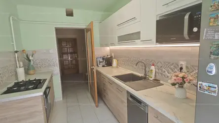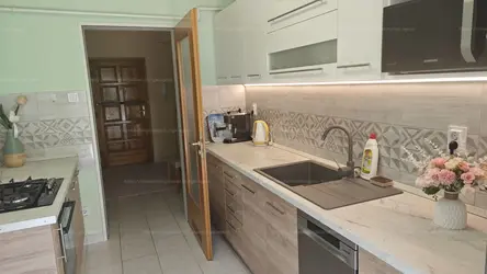 - A két szoba között helyezkedik el a konyha, amelyet úgy terveztek, hogy az egyik oldalon KÖZVETLEN KAPCSOLATOT biztosítson a TERASSZAL – praktikus megoldás a hétköznapokhoz, legyen szó reggeli kávéról vagy esti pihenésről.