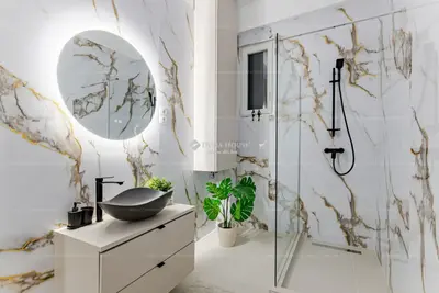 Stílusos fürdőszoba walk-in zuhanyzóval.