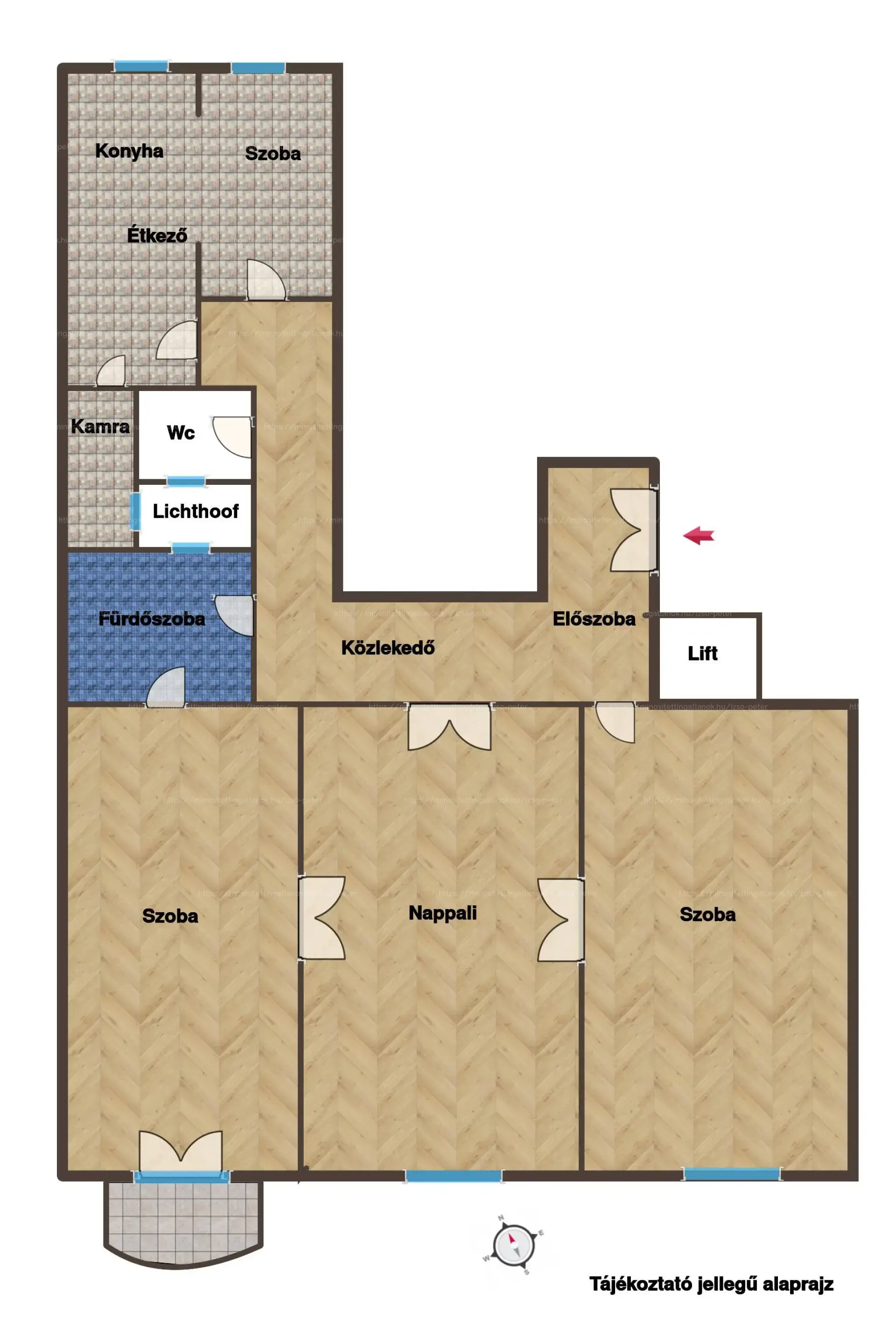 - az egykori grófi lakás az 5.emeleten található, 115 m2-es, erkélyes, 4 szobával, hallal és egyéb hasznos helyiségekkel kialakított