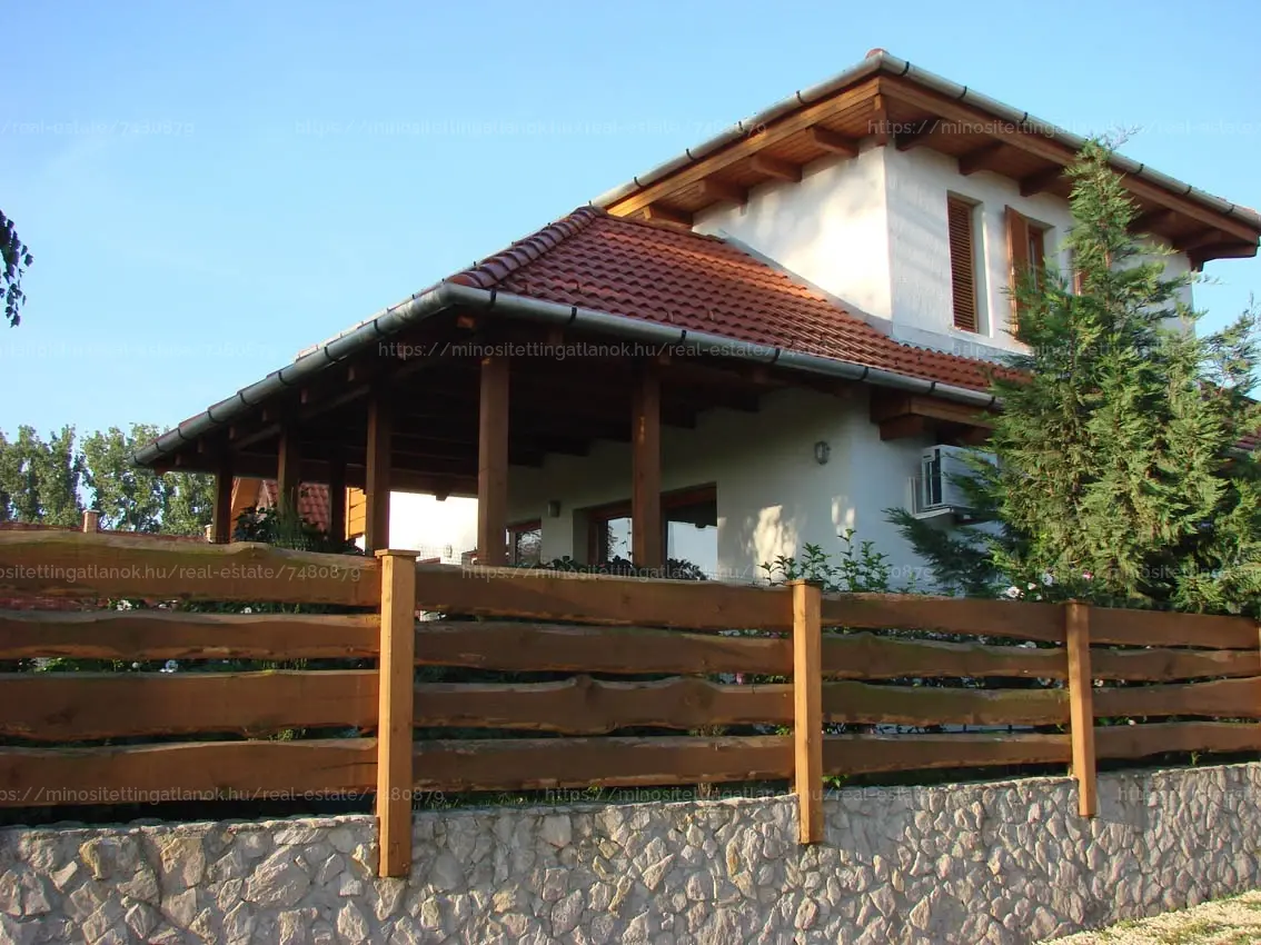 Az ingatlant a Szep Hazak magazinban is bemutatott epiteszcsapat tervezte 2002-ben epült fel. Alapanyagok: Matratherm 38 fal, Mediterran beton tetőcserép, prémium fa nyílászárók, a nappaliban kandalló mely a felsö folyosot is füti, Split klíma. Kombi kazan potlasra szorul. Kerites fa elemei pedig felujitasra. A Termeskövel burkolt kerites es a kocsibejaro a garazsig meszkö-tufa.