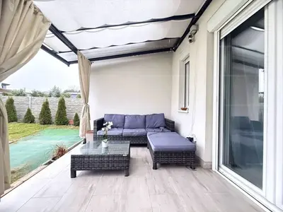 A nappaliból 12 m²-es fedett terasz nyílik közvetlen kertkapcsolattal. A körbekerített, hatalmas kert automata öntözőrendszerrel ellátott. s 2 autó számára kocsibeálló biztosított.