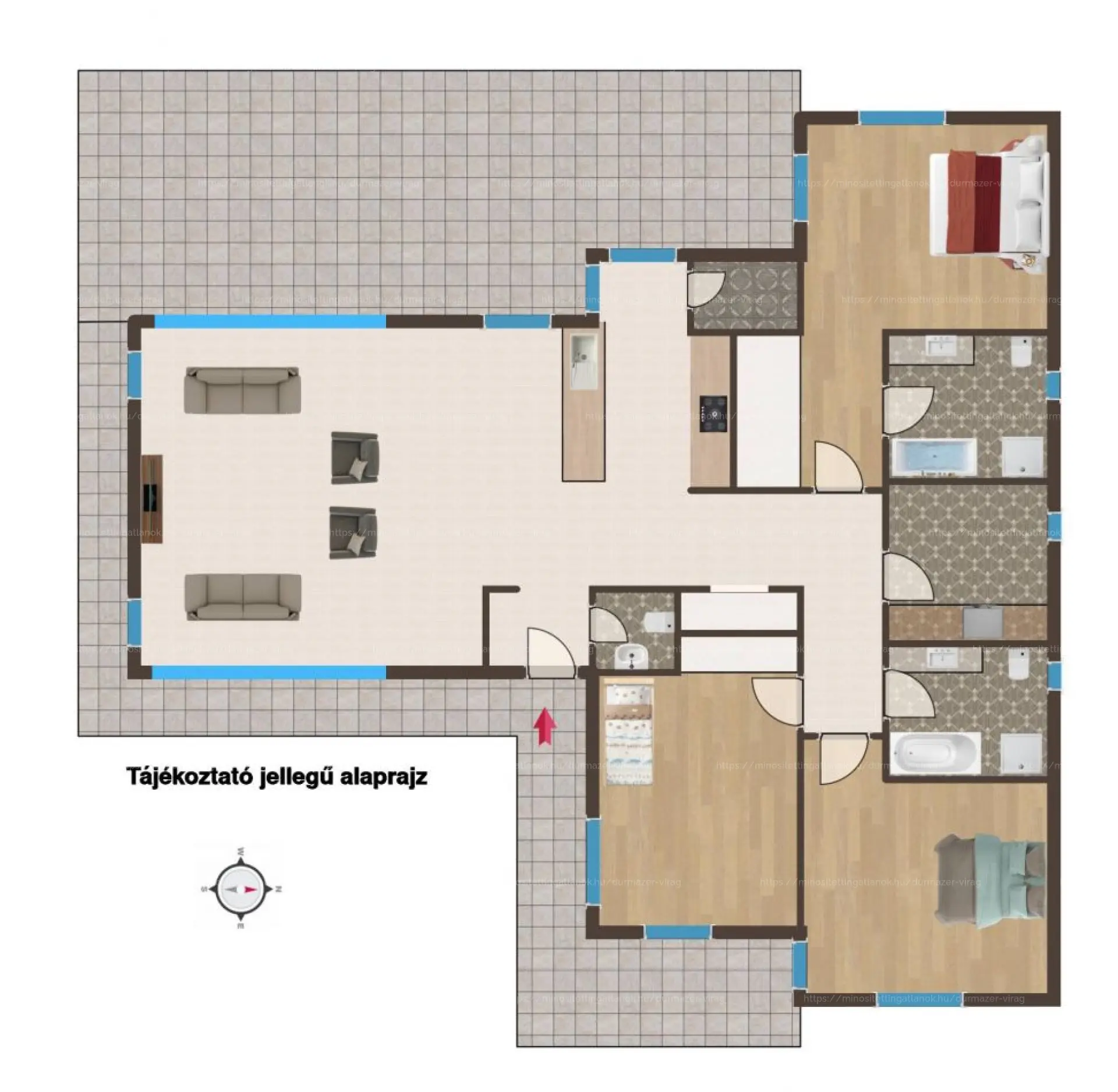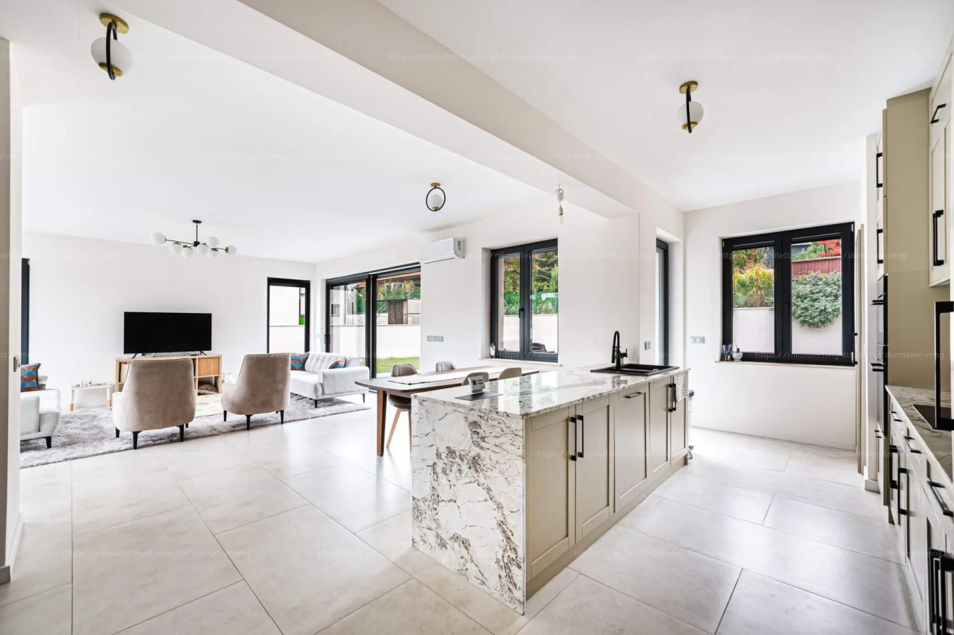 - Egyszintes, kiváló elrendezésű: tágas nappali, 3 világos hálószoba, 2 tágas fürdőszoba és külön vendégmosdó