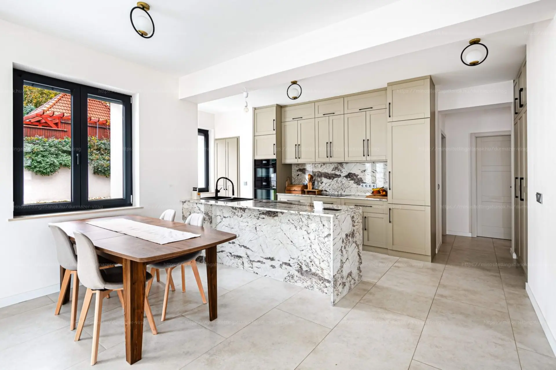 - Konyhája és beépített szekrényei magas minőségben, asztalos által kivitelezett.