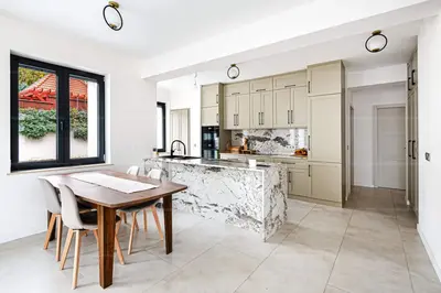 - Konyhája és beépített szekrényei magas minőségben, asztalos által kivitelezett.