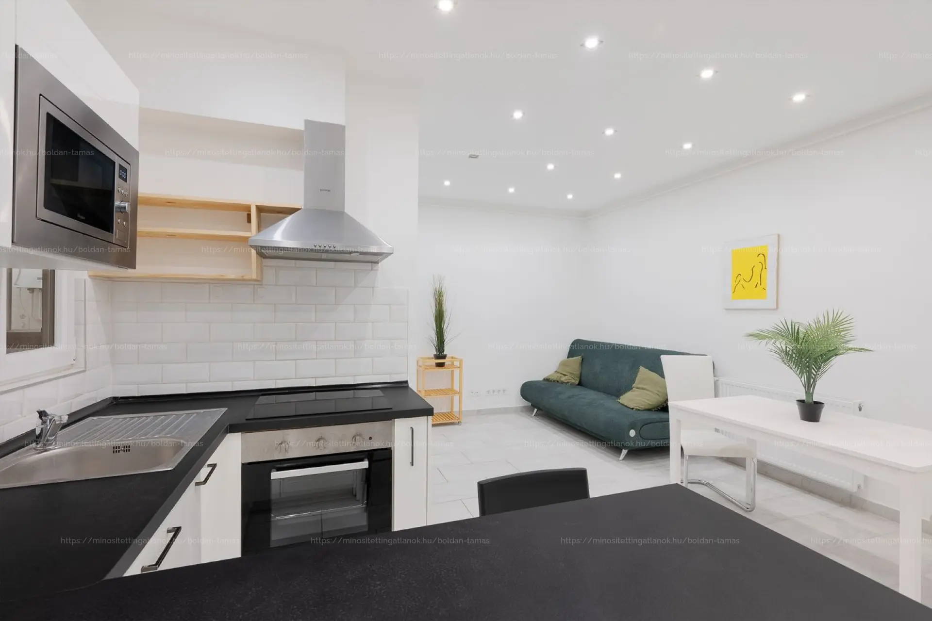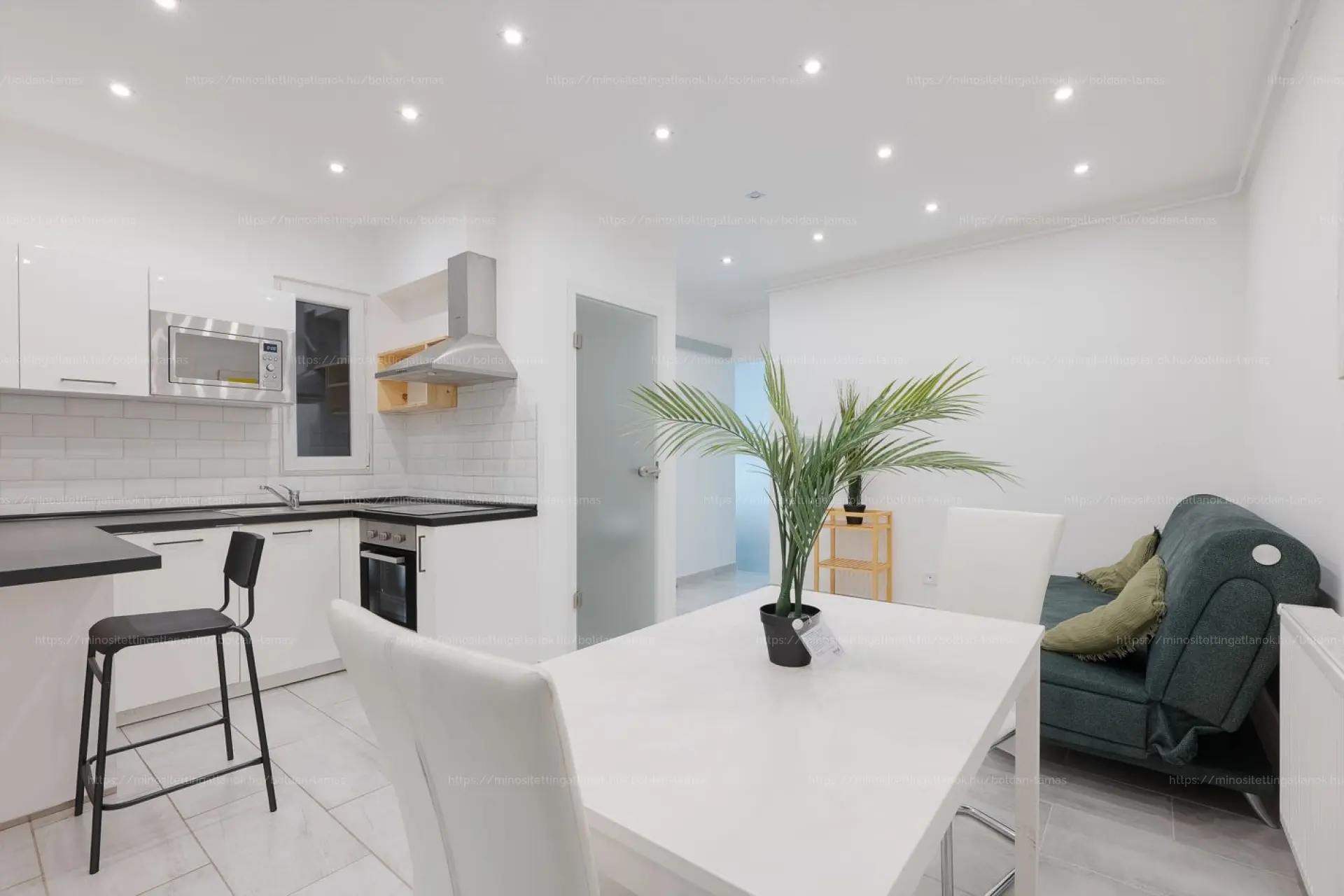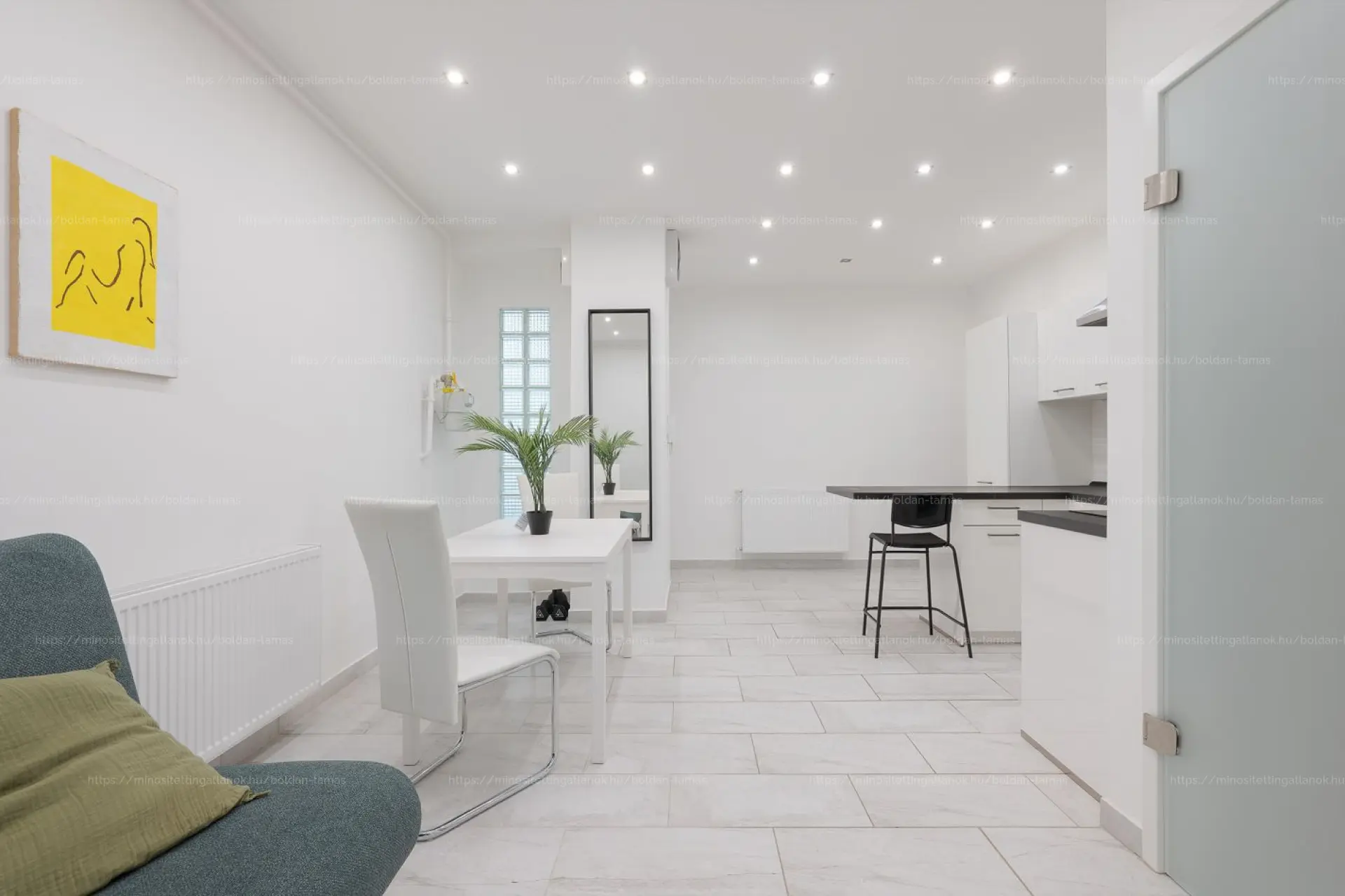 A helyiség mérete lehetővé teszi, hogy étkezőt és egy kisebb nappali/társasági részt is kialakítsunk – baráti vacsorákhoz, beszélgetésekhez bőven elegendő.