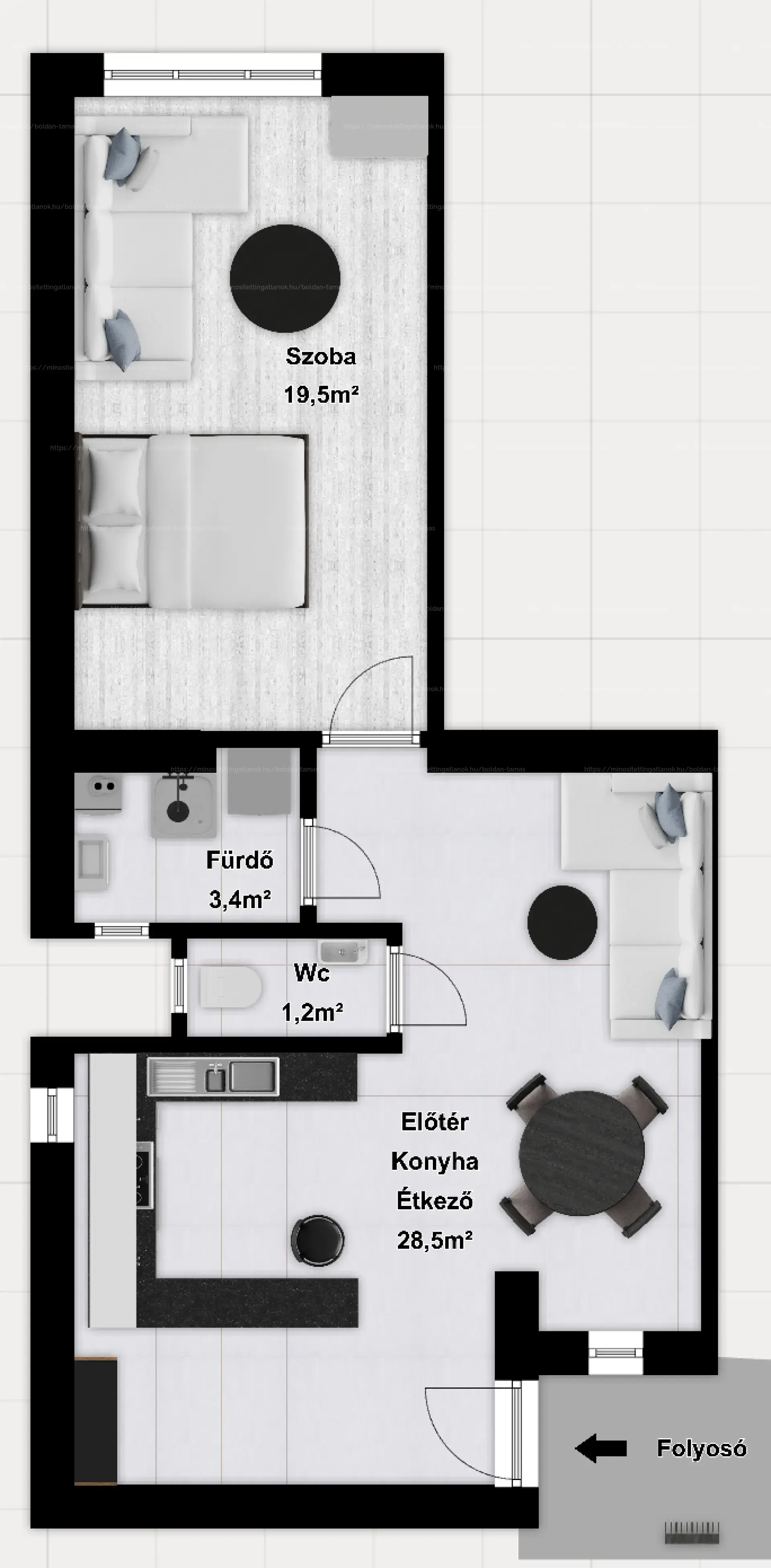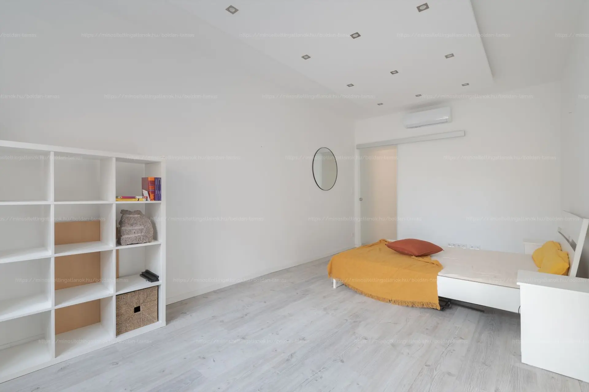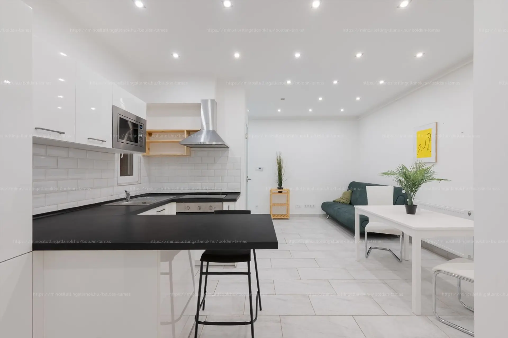 A helyiség mérete lehetővé teszi, hogy étkezőt és egy kisebb nappali/társasági részt is kialakítsunk – baráti vacsorákhoz, beszélgetésekhez bőven elegendő.