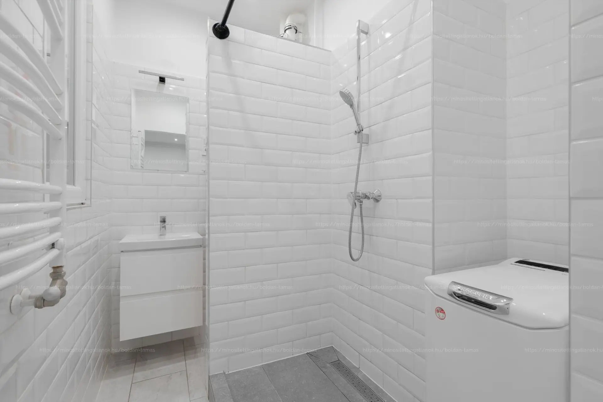 A fürdőszobában kapott helyet: a mosógép, és a cirkó kazán, praktikusan elrejtve, mégis jól hozzáférhetően.