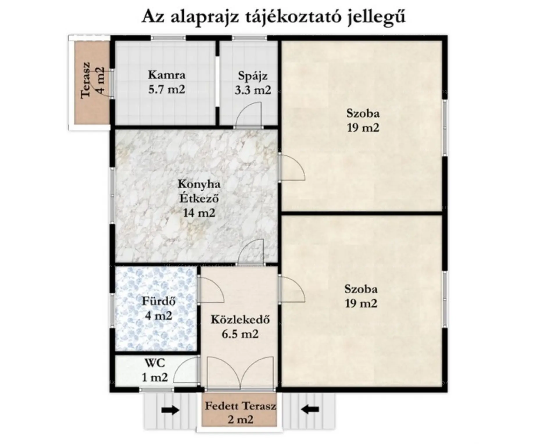 A ház oldalán egy fedett teraszról lépünk be, innen jutunk a folyosó/közlekedőbe. A közlekedőből balra nyílik a külön WC és a fürdőszoba, amelyben kád és zuhany is van, jobbra találjuk az egyik lakószobát, szemben pedig a tágas, világos konyha–étkezőt. A konyhából nyílik a másik lakószoba, valamint a spájz–kamra rész, ahonnan egy hátsó kijáraton át ki tudunk menni a hátsó udvar felé lévő kis teraszra. A kamra és spájz egybenyitásával, akár még egy plusz szoba is kialakítható, tehát az ingatlan bővíthető. A tetőtér beépíthető, így hosszabb távon is jó alap egy családi otthonhoz.