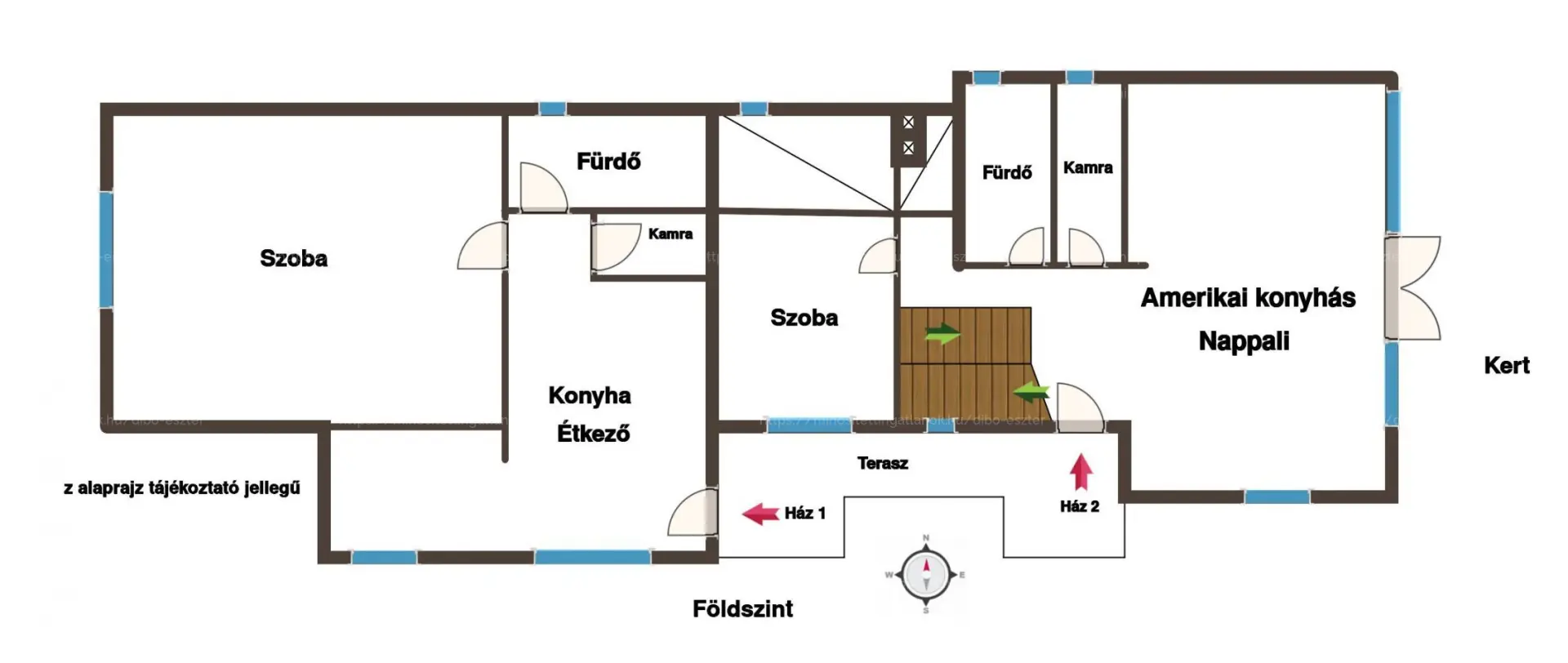 A ház két különálló lakrészből áll: a 2004-ben épült, belső 2 szintes lakás összesen 110 nm-es. A földszintjén tágas, amerikai konyhás nappali található egy hozzákapcsolódó, 21 nm-es nyitott terasszal. Ezen a szinten található még egy napos, 14 nm-es vendégszoba, egy rejtettzuhanyzós fürdőszoba és egy praktikus kamra. Az emeleten két tágas, vilgáos hálószoba és egy nagyon szépen felújított fürdőszoba kapott helyet.