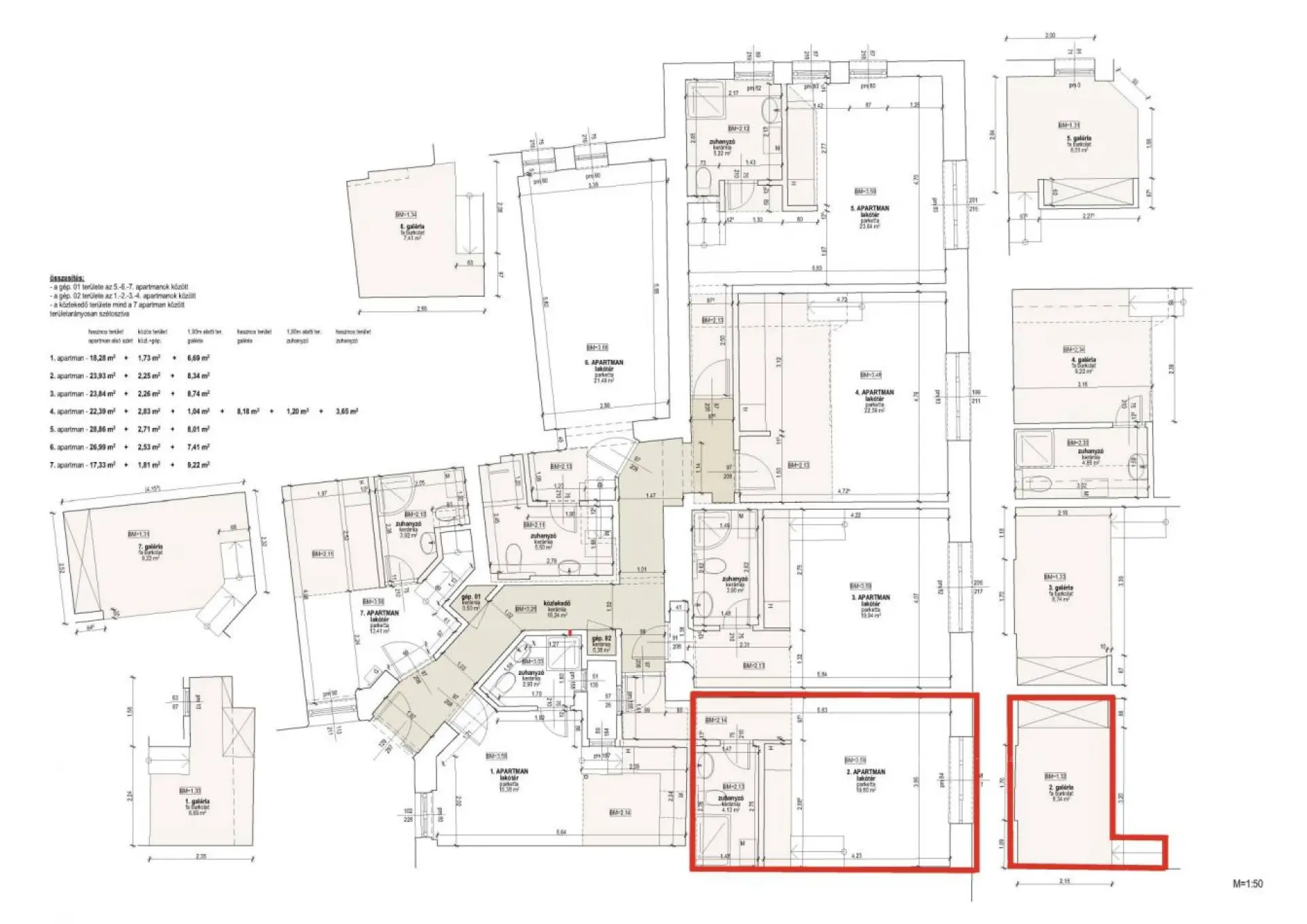 Az ingatlan 1/1 tulajdonú, tehermentes, osztatlan közös tulajdon, ügyvédi használati megosztással, két nagyobb lakásból kialakított, összesen hétlakásos kialakítás részeként jött létre, az alaprajzon pirossal jelölve egyértelműen beazonosítható, hogy pontosan melyik lakás kerül értékesítésre.