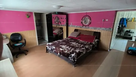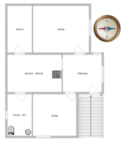 A felső lakószinten egy előszobával egybenyitott, világos konyha, két kényelmes szoba, egy fürdőszoba és egy kamra kapott helyet. A szobák egyikében modern laminált padló, a többi helyiségben pedig praktikus járólap burkolat található.