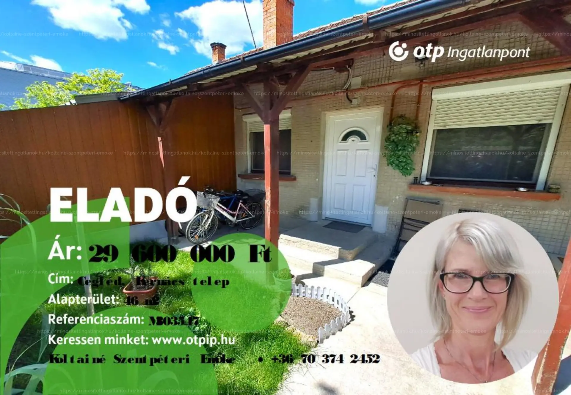 A komfortos földszintes lakásban két szoba, egy konyha, egy fürdőszoba-WC helyiség, egy előszoba, egy külső tároló és egy 13 m2-es fedett terasz kis parkosított udvarral kapott helyet. A sorház beton alapon tégla falazattal épült, víz ellen szigetelt, száraz. A homlokzat jó állapotú vakolt, igény szerint hőszigetelésre, kőporozásra vár. A födém fa szerkezetű, szigetelt és gipszkartonnal borított. A tetőszerkezet fából készült, jó állapotú, masszív, bakdúccal és székállással készült, beázástól mentes. Héjazata égetett cserepezést kapott, körben csatornával ellátott. A lakás helyiségei laminált padló- és járólap burkolatot kaptak. A külső nyílászárók hőszigetelt műanyagok, redőnnyel és szúnyoghálóval ellátottak. A belső ajtók jó állapotúak, normál fa szerkezetűek. Az összközműves ingatlanban az egyfázisú villany (16 Amper), a vezetékes víz, a csatorna, és a gáz rendelkezésre állnak. A lakás biztonsági kamera rendszerrel ellátott. Az otthon melegéről helyiségenként gázkonvektor gondoskodik, a melegvíz ellátás villanybojlerrel biztosított. Az udvar rendezett, körben bekerített. Gépjárművek számára a földes zsákutcában a lakás előtt, közvetlen parkolás lehetséges. Aszfaltos út 50 méterre elérhető. A város infrastruktúrája pár perces autóúttal elérhető, a tömegközlekedés kiépített. A hirdetés tájékoztató jellegű, az ingatlanról pontos adatokat a megtekintést követően a tulajdonos által elmondottak alapján tudunk garantálni! Az ingatlan jelenleg is lakott, birtokba adás megegyezés szerint lehetséges, vétel esetén a lakás komplett bútorzata kiürítésre kerül. A vásárlás finanszírozásában az OTP kedvezőbb kamatozású hitelkonstrukcióival tudunk segíteni. Az adásvételi szerződés lebonyolításához korrekt ügyvédi közreműködést tudunk ajánlani. Amennyiben felkeltettem érdeklődését, hívjon bizalommal!