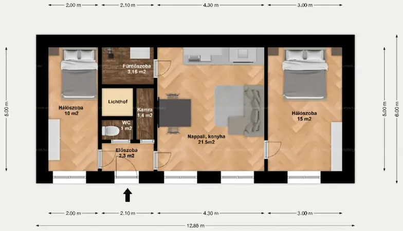 - Nappali konyhás + 2 különálló szoba + fürdő + külön WC