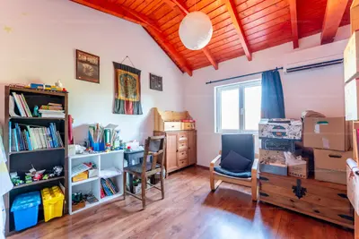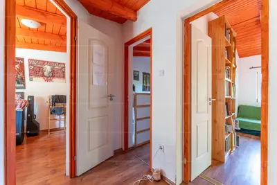 A ház alapterülete 84,25 m², a terasz 20 m²-es (ennek fele, azaz 10 m² számít bele a hasznos alapterületbe), a földszinten pedig egy 8,9 m²-es tároló található. A bejáraton belépve egy előszobába érkezünk, innen nyílik a nappali, a konyha, valamint egy fürdőszoba. Az emeleten két hálószoba, egy félszoba és egy külön WC kapott helyet. A tágas terasz az egyik szobából, illetve az udvar felől is megközelíthető. A kellemes hőmérsékletről hűtő-fűtő klíma, svéd fűtőpanelek, valamint egy működő cserépkályha gondoskodik, amelyhez kémény is tartozik. Két villanyóra van és van H tarifa is.