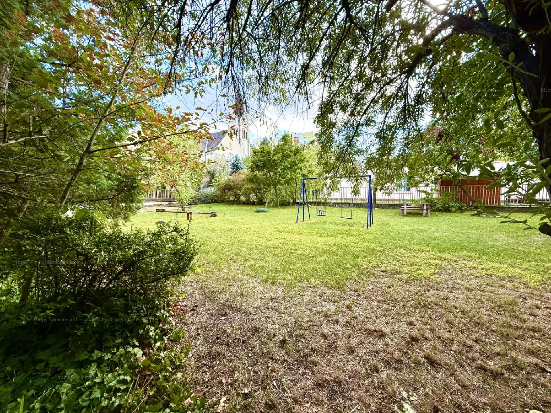 A lakás egy zárható, közös használatú kertből közelíthető meg, ahol gyümölcsfák, homokozó, csúszda és hinta is a lakók rendelkezésére áll.