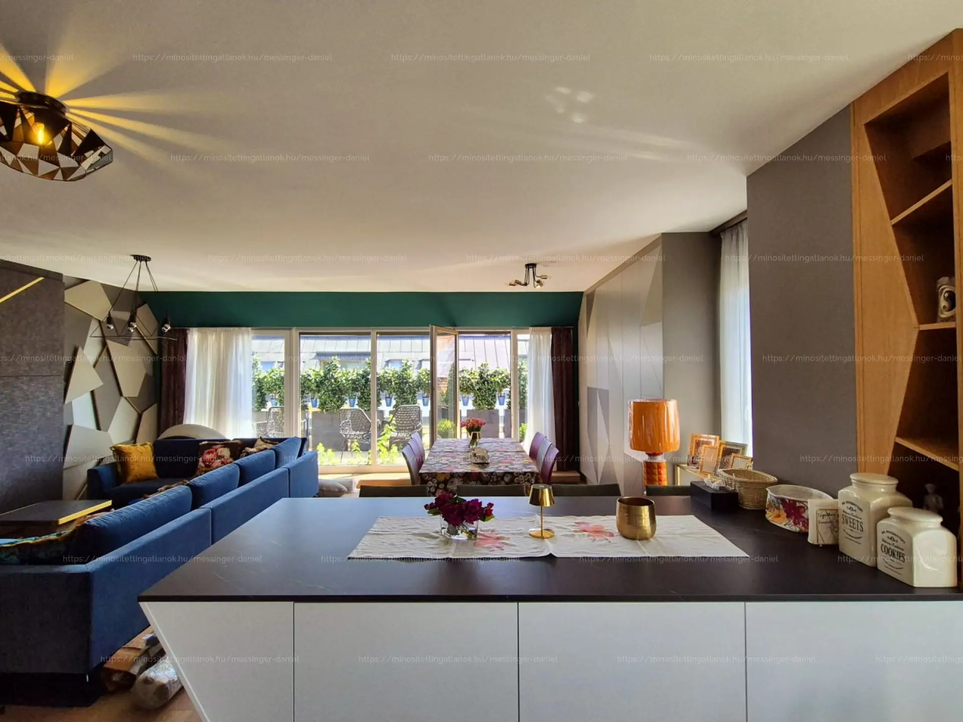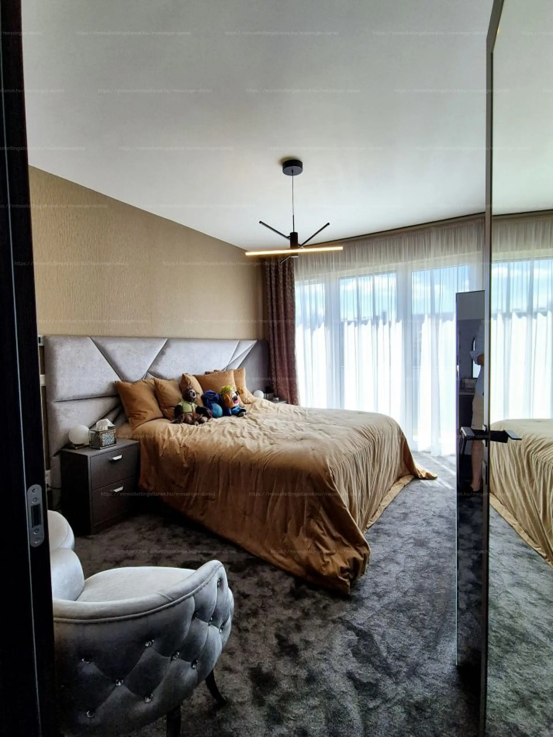 Beosztása: hatalmas nappali, felszerelt minőségi konyha (spájz), étkező teraszkapcsolattal. Egy külön kis “lakosztály” került kialakításra, gyereknek fürdővel, gardróbbal. 4 hálószoba, 2 fürdőszoba, 3wc, mosóhelyiség.