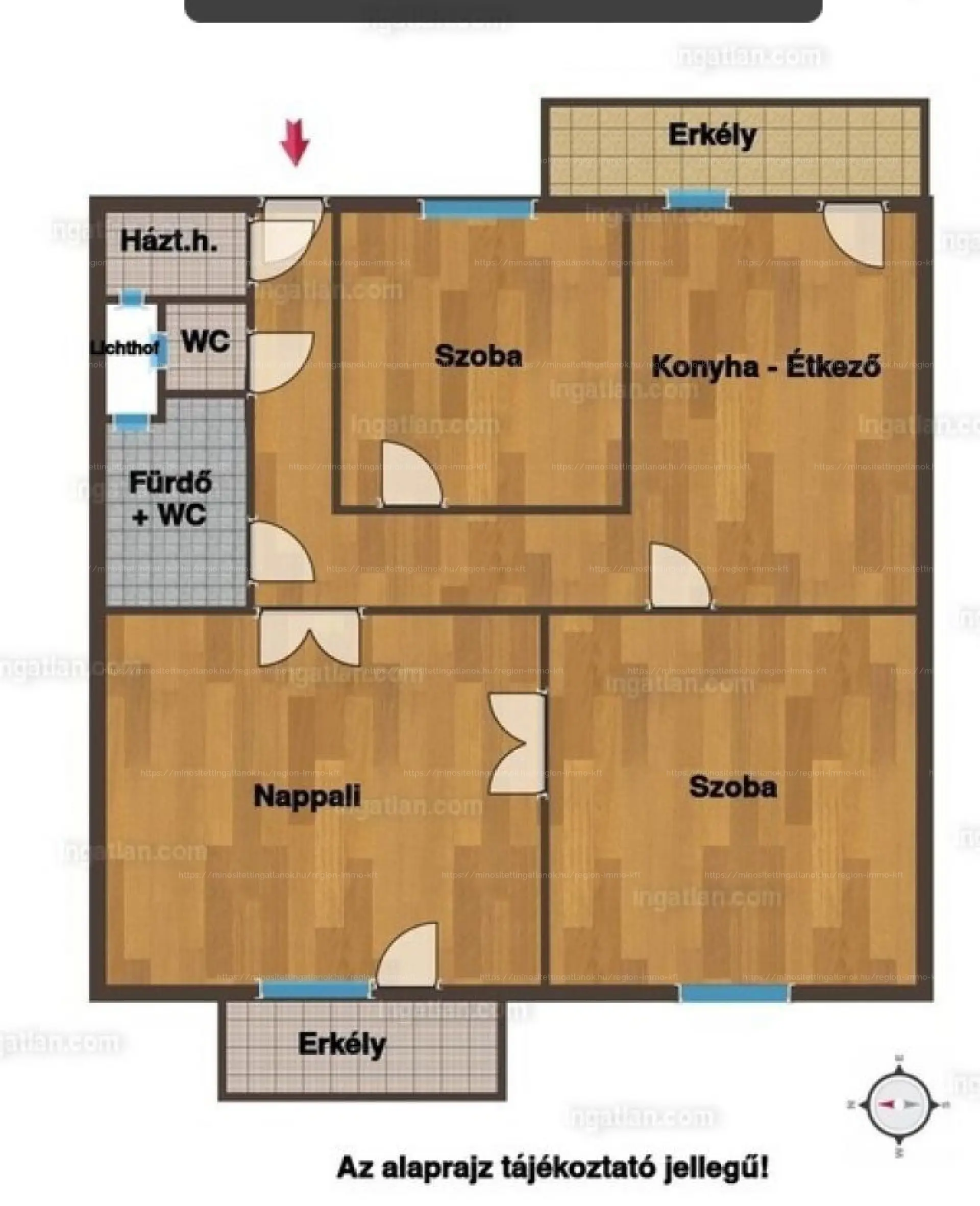 A tágas előtérből nyílik a tároló, mosdó, fürdőszoba, a 3 szoba és a konyha.