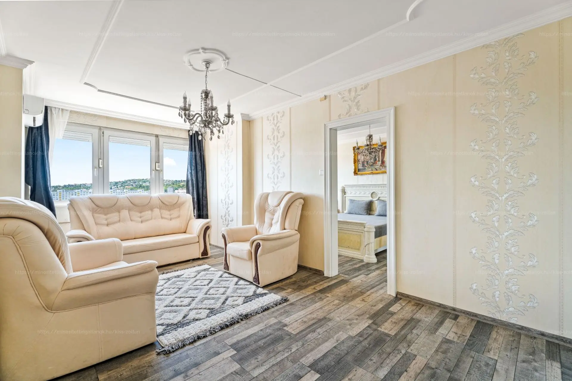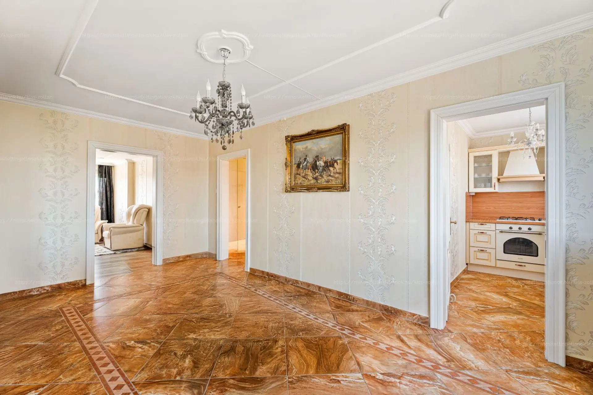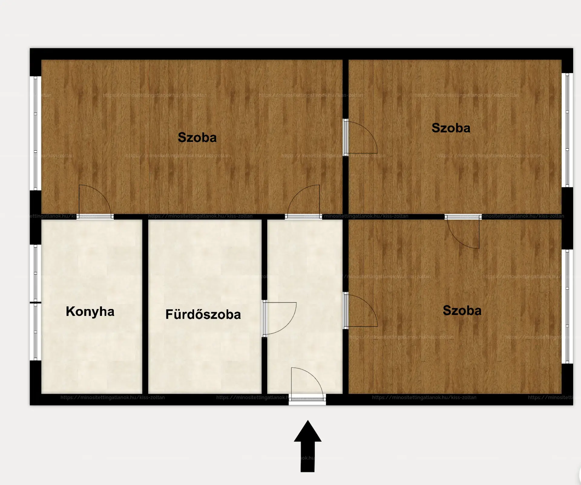 Burkolatát tekintve, a hideghelységekben és a nappaliban járólap, míg a szobákban laminált parketta található.
