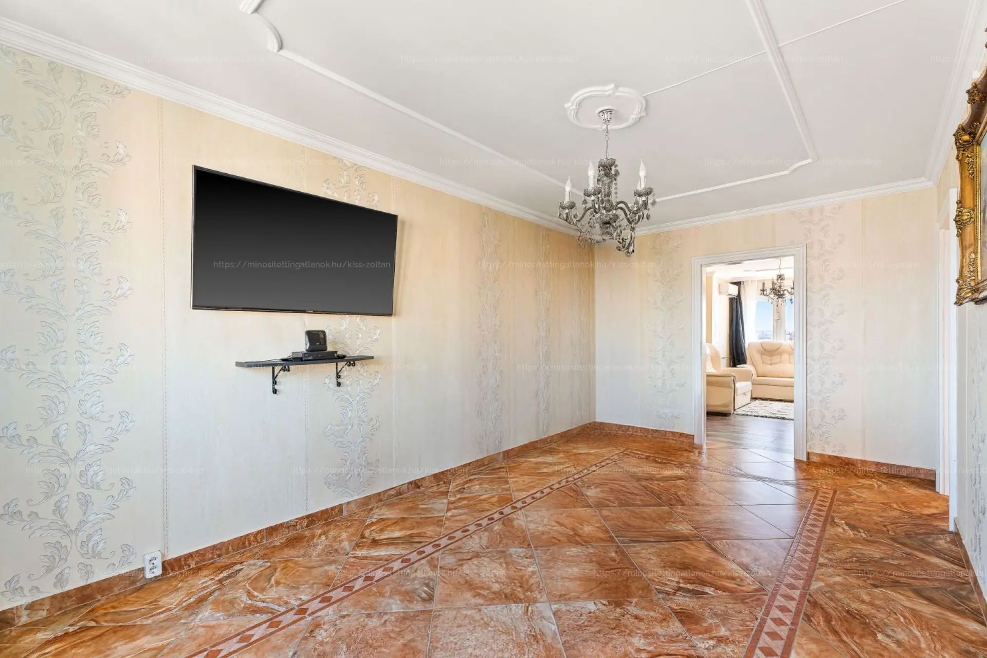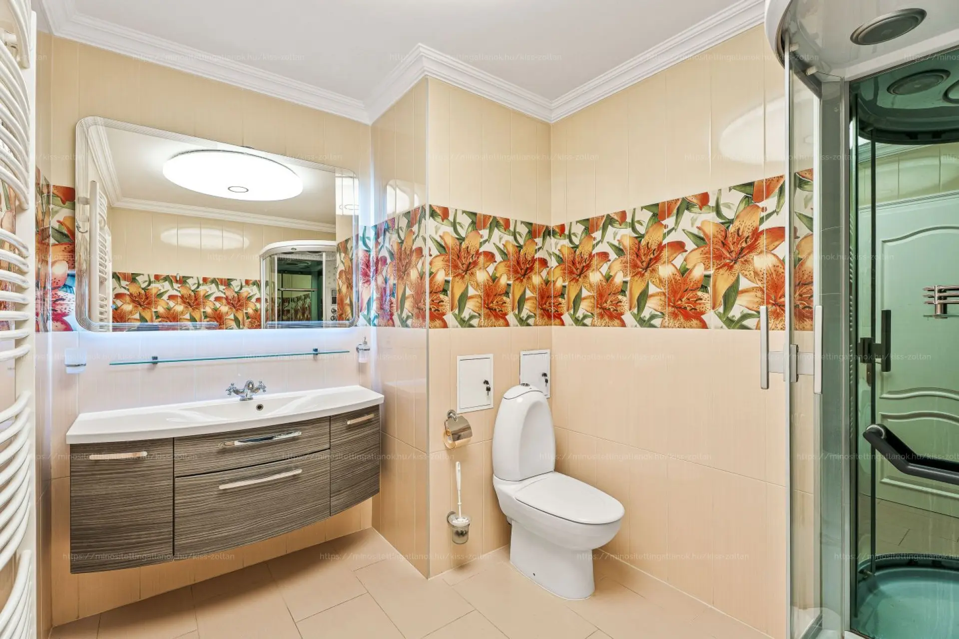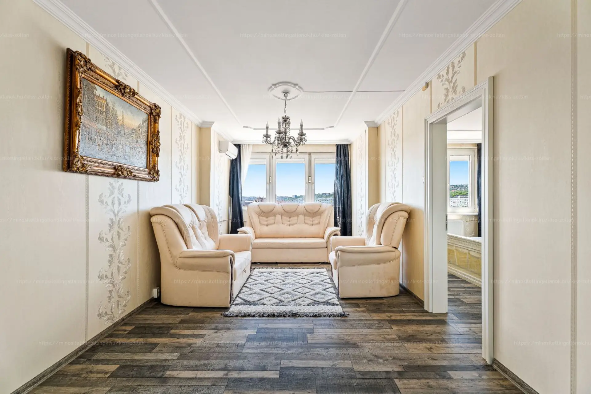 Burkolatát tekintve, a hideghelységekben és a nappaliban járólap, míg a szobákban laminált parketta található.