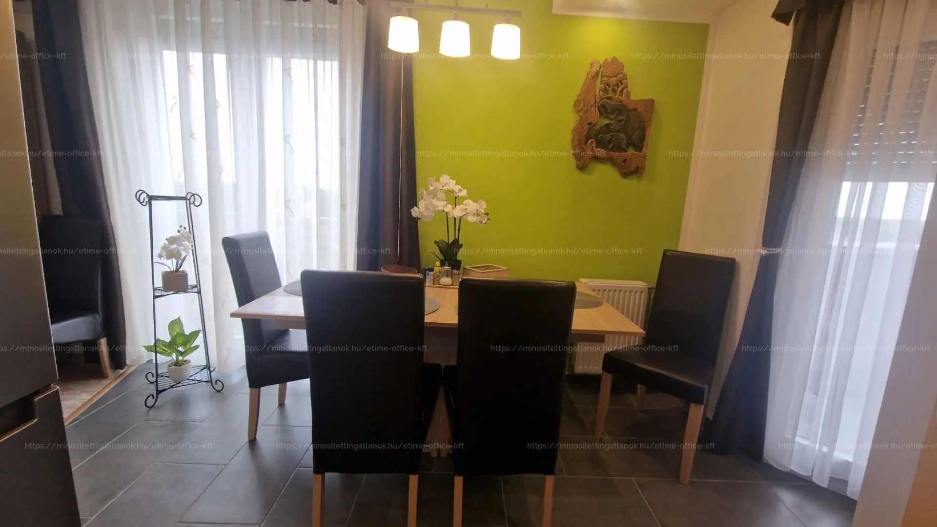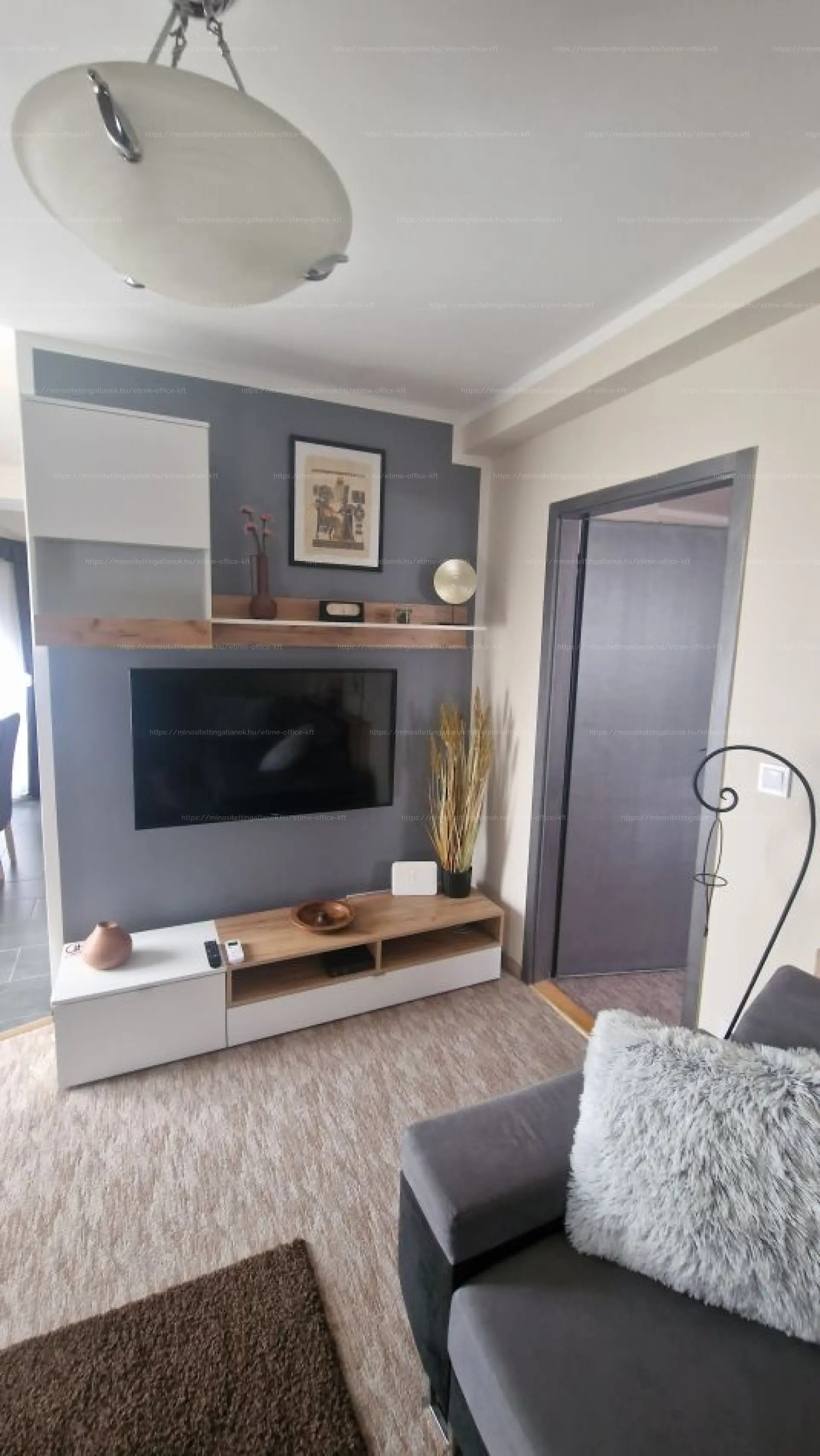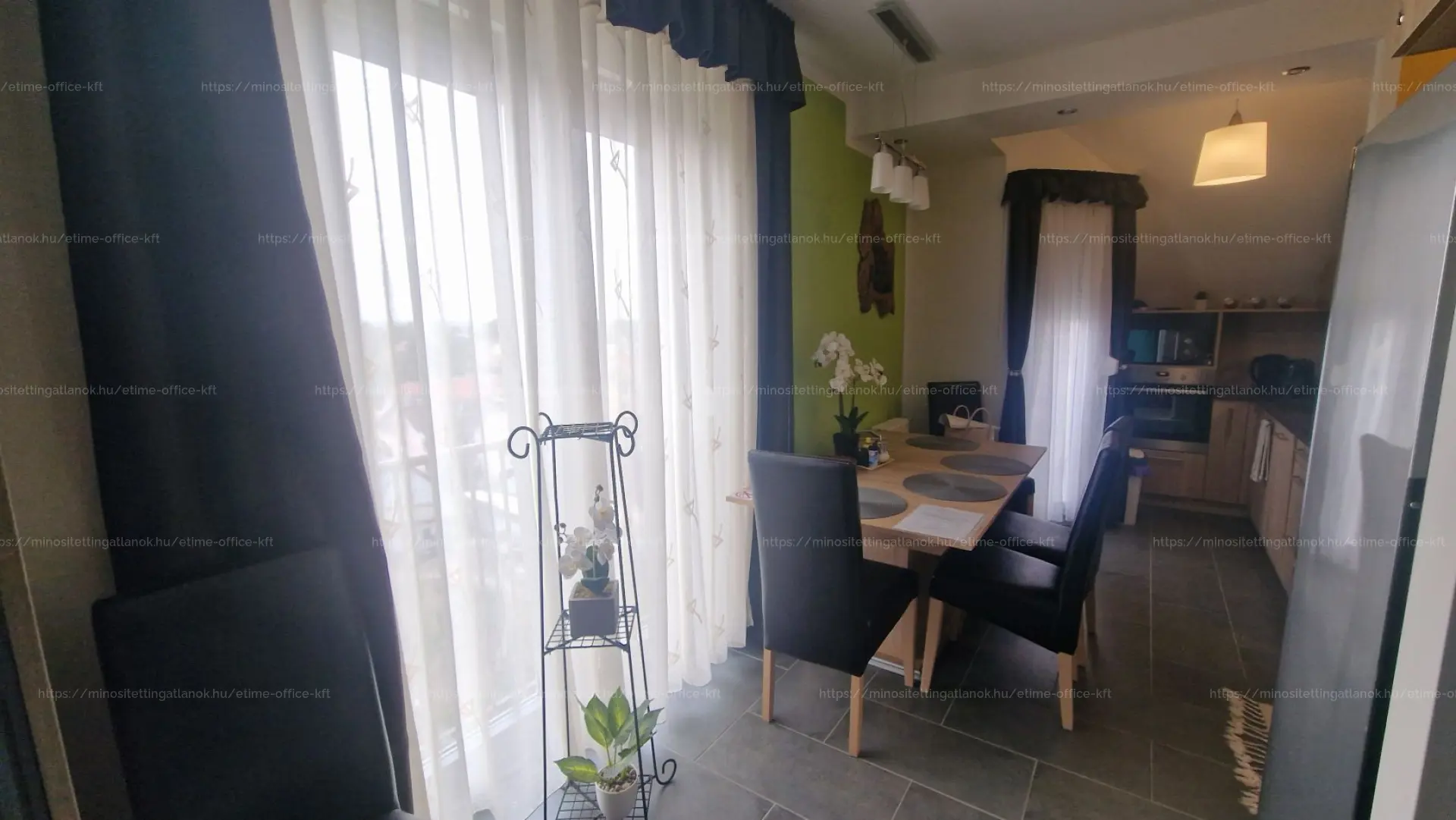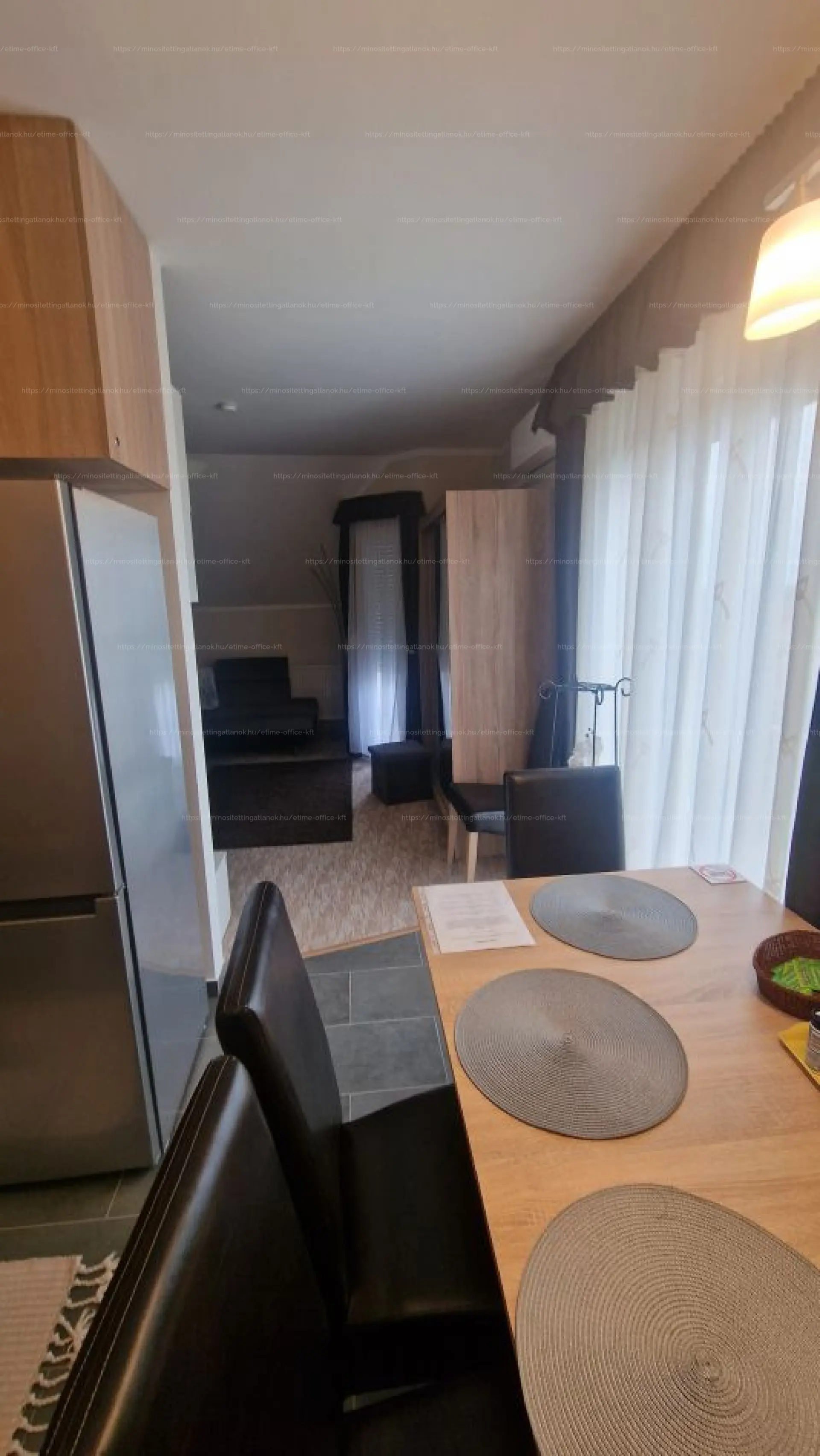 (étkezőasztal, sarokgarnitúra, TV, franciaágy, méretre gyártott szekrények, konyhai gépek).