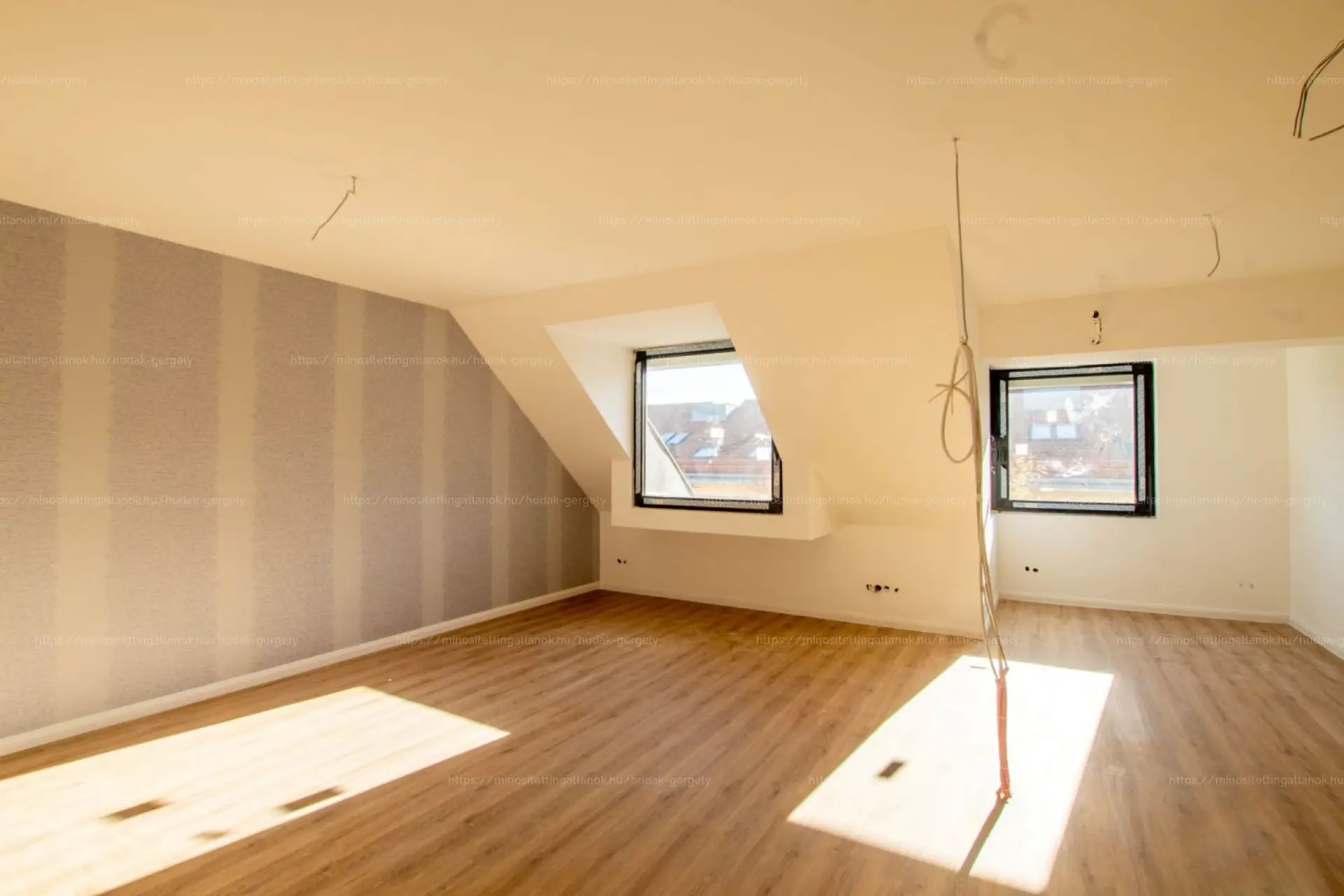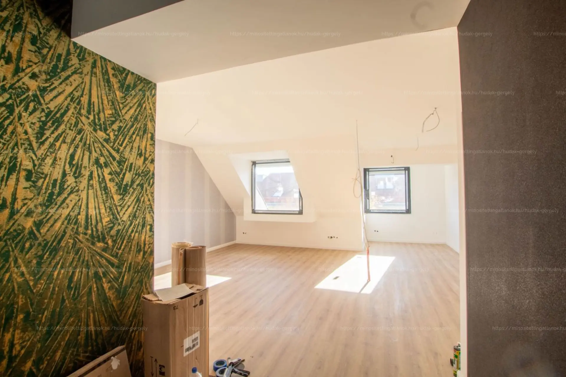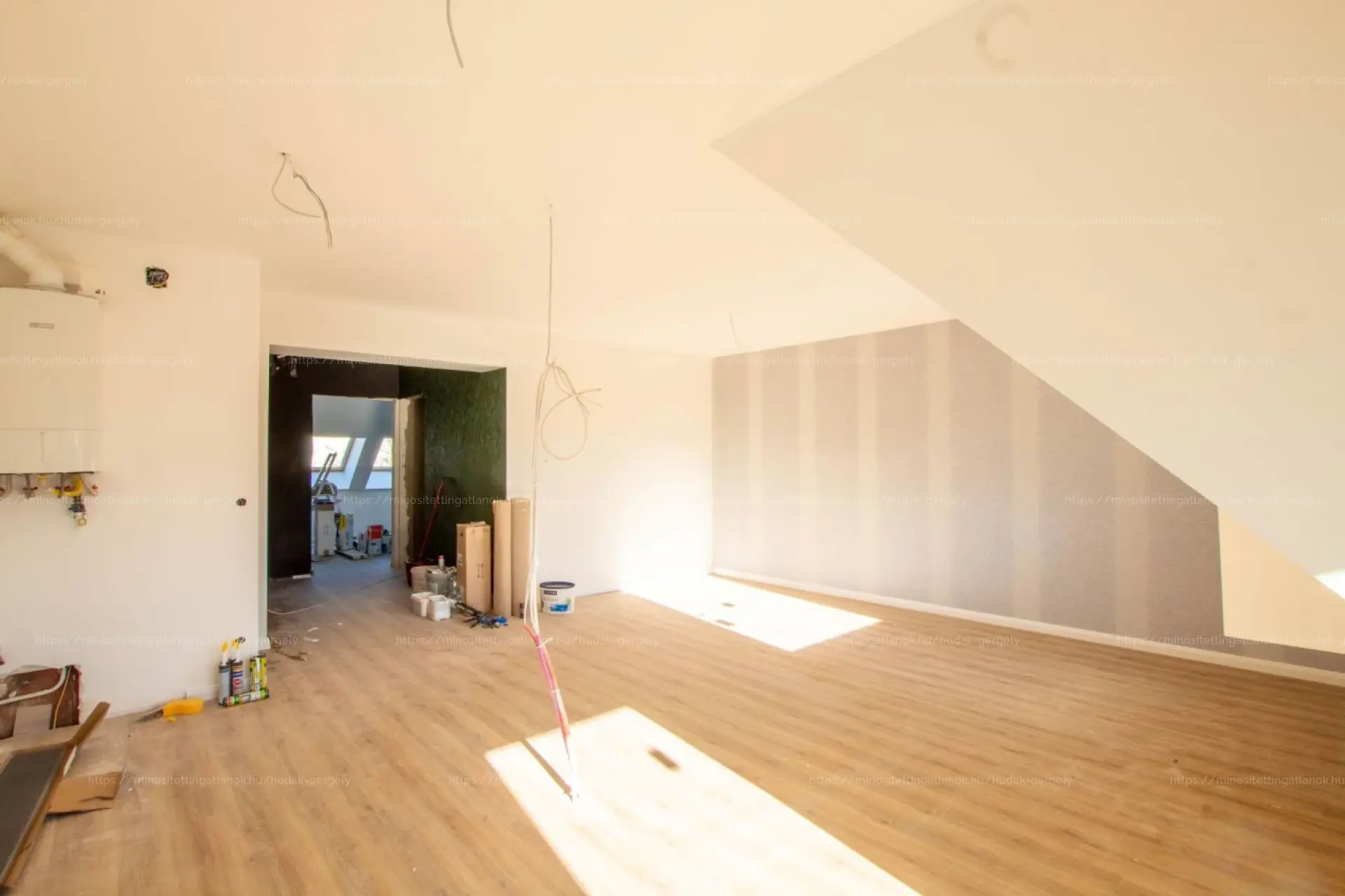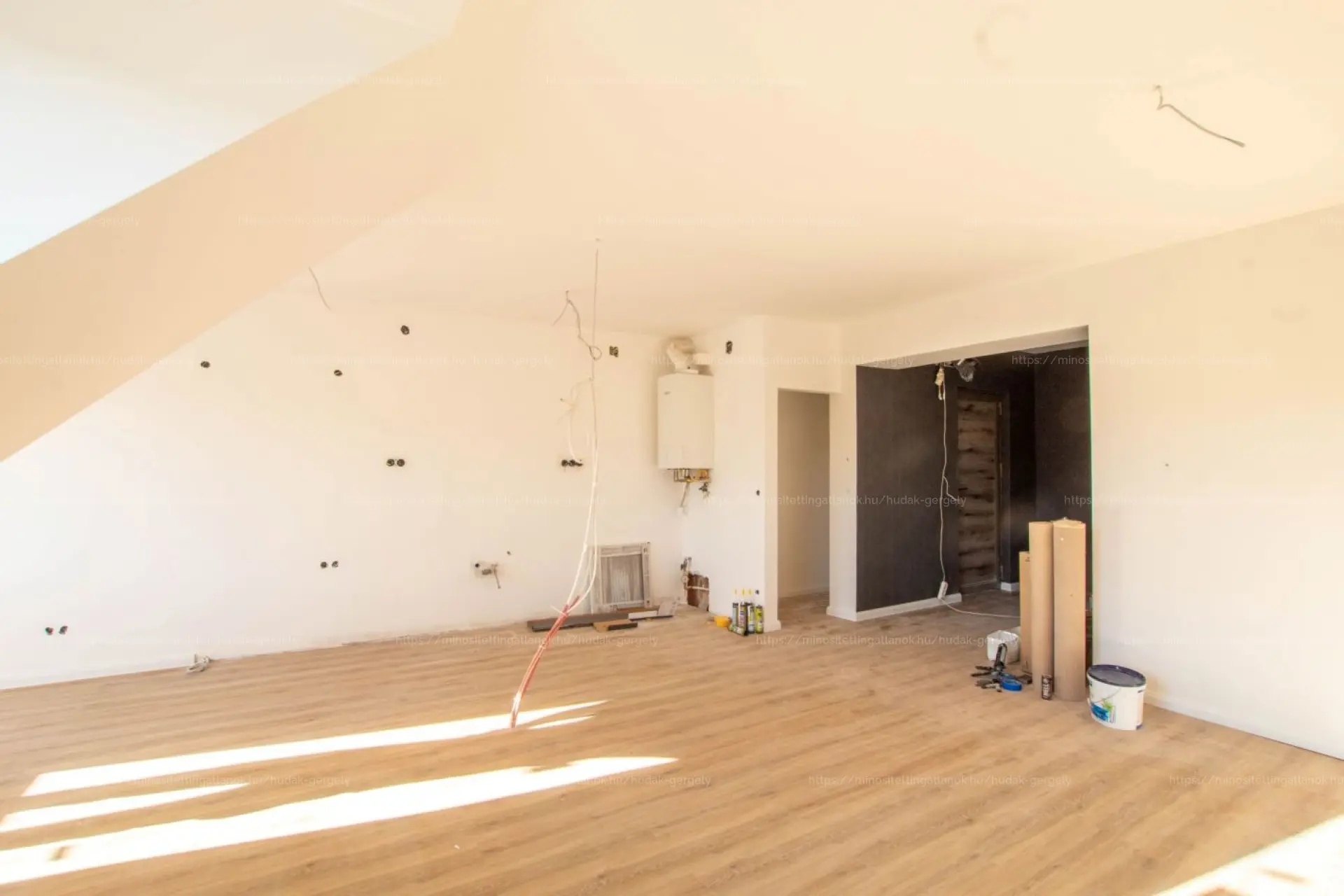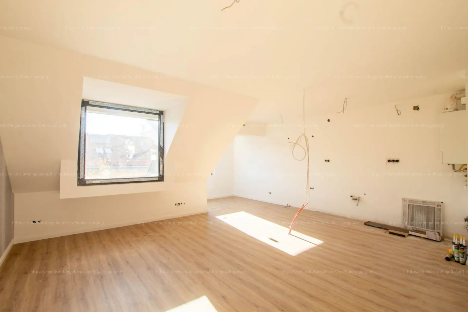 A lakás a legfelső szinten van, Németvölgy városrészében. A helyiségek közé tartozik: nagy nappali-amerikai konyha, egy hálószoba, fürdőszoba, előtér és tároló. Még néhány apró befejező munka és a konyhabútor, valamint a beltéri ajtók beépítése van hátra, ezek a következő hetekben készülnek el.