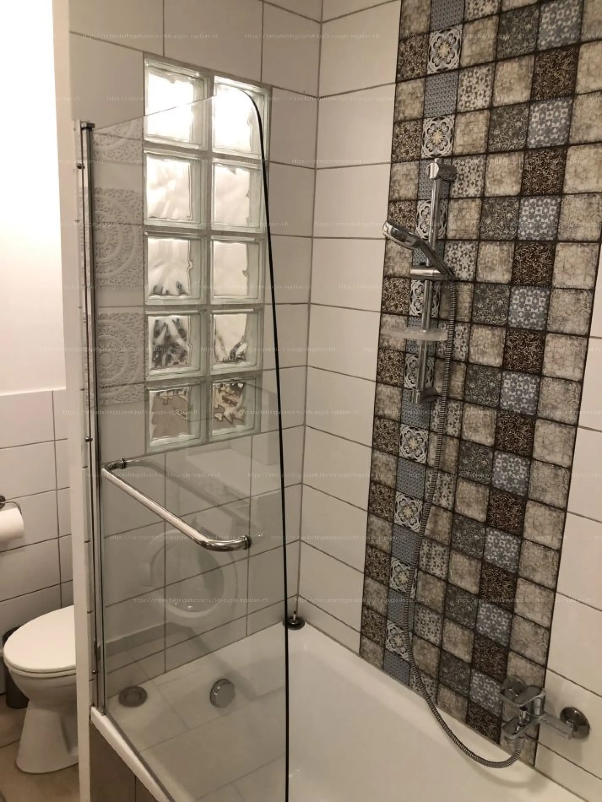 Mellette külön vendég WC.A fürdőben zuhanyozós kád, elegáns beépített bútor és WC található.