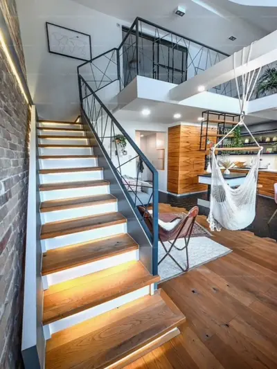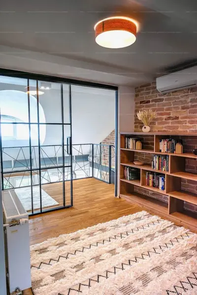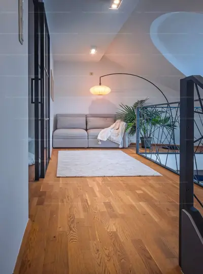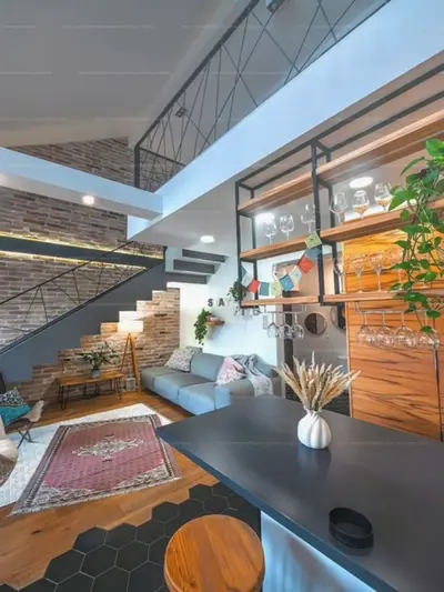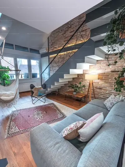 ​A lakást design tervező álmodta meg, és kétszintes elrendezésű, 94 nettó négyzetméter alapterületű.