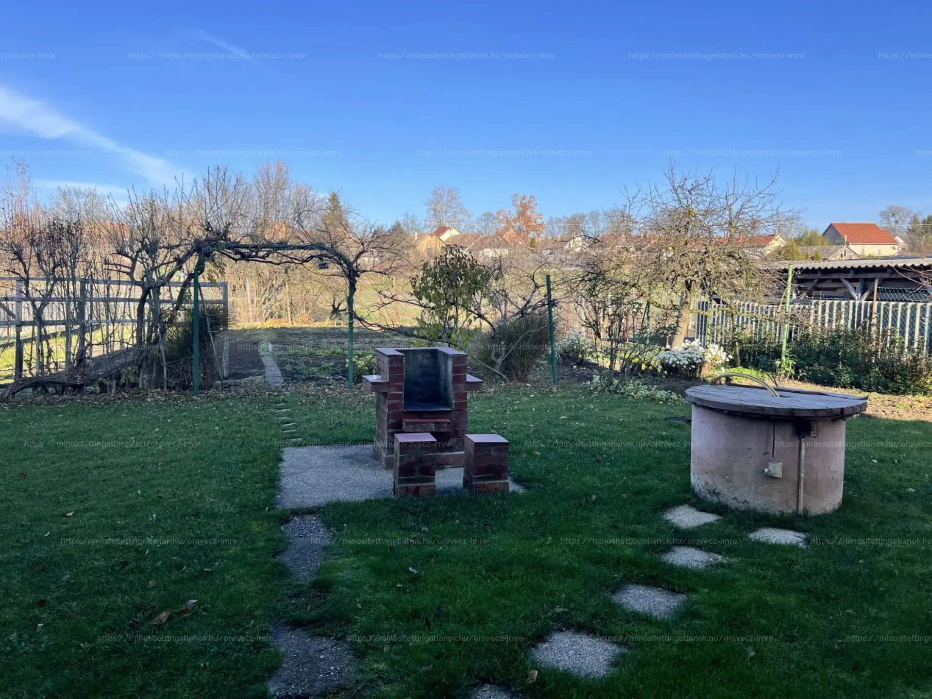 Telek: 826 m², délelőtti fekvésű, méltányolt minőségű talajjal és gyümölcsös növényekkel (málna, szeder, barack, körte, cseresznye, mogyoró).