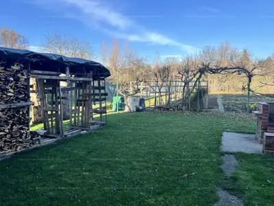 Telek: 826 m², délelőtti fekvésű, méltányolt minőségű talajjal és gyümölcsös növényekkel (málna, szeder, barack, körte, cseresznye, mogyoró).