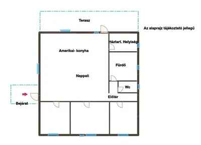 3 hálószoba, amerikai konyhás nappali, fürdőszoba, külön WC és háztartási helyiség került kialakításra. A tágas, napfényes nappaliból közvetlen kijárat nyílik a teraszra és a kertbe, így a családi és baráti együttlétekhez tökéletes életteret biztosít.