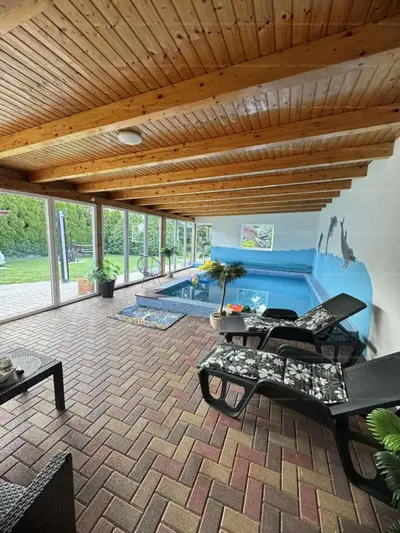 Az ingatlan egyik extra felszereltsége közé tartozik a kb 45 m2 -es beépített teraszon lévő 3.5 méter X 5.5 méter belső úszómedence , melyben megmártózhat szinte az év bármely napján ……