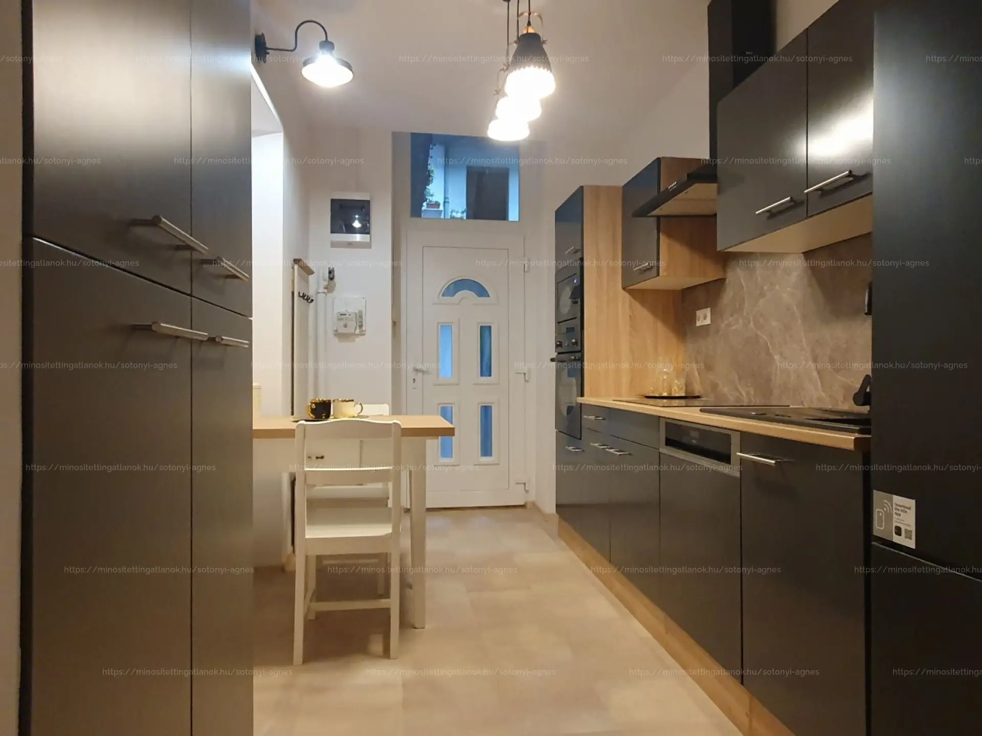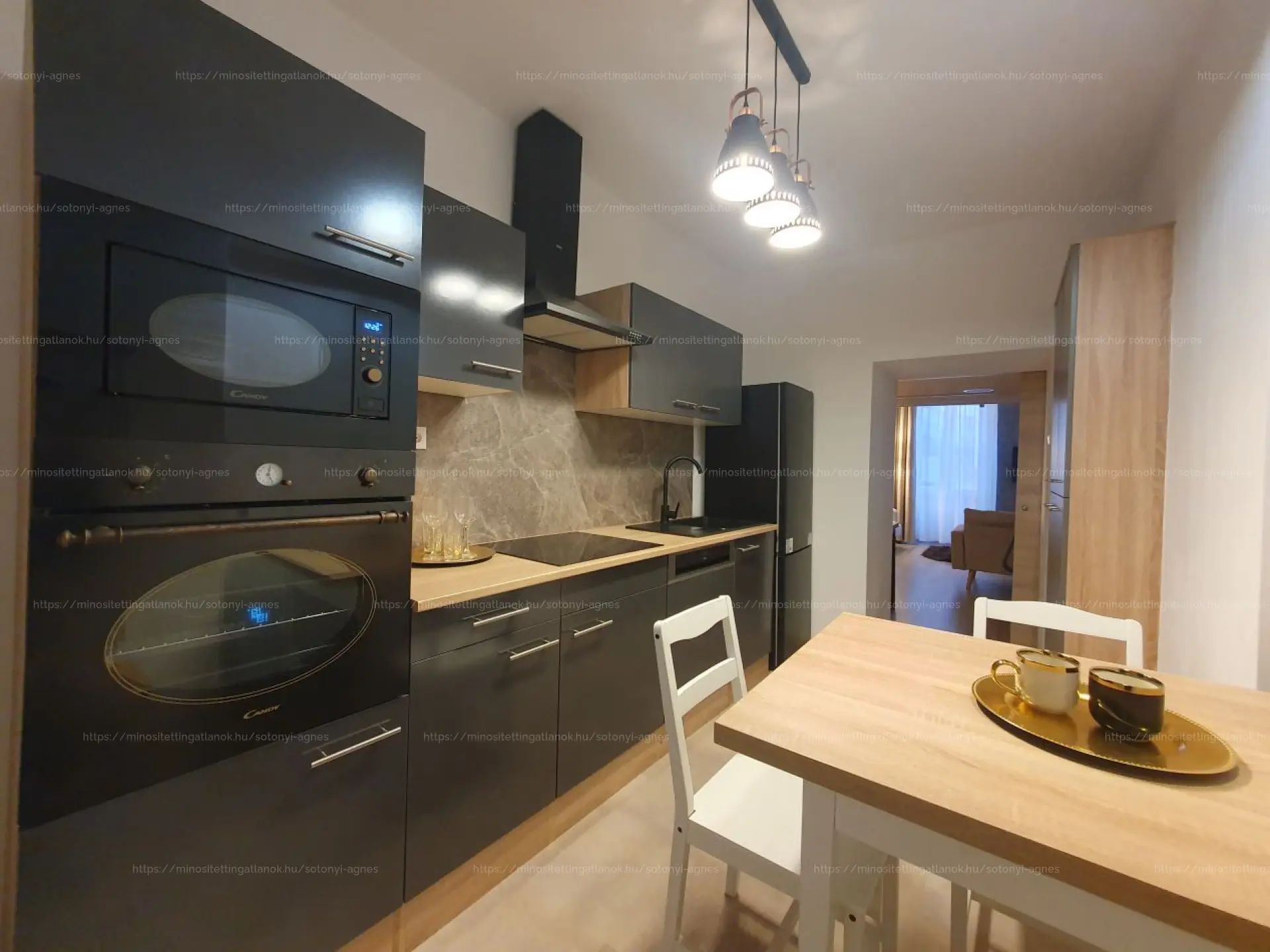 A konyha felszereltsége: sütő, főzőlap, mikró, mosogatógép, mosó–szárító, hűtő.