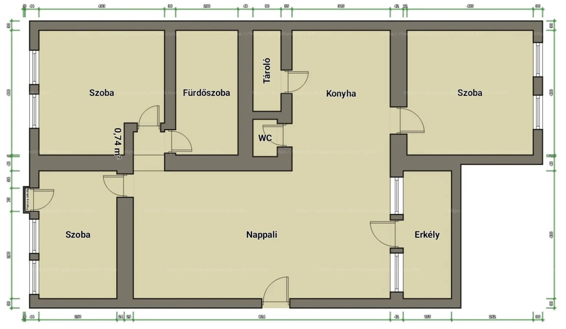 Két erkély: egy 6 nm-es a nappaliból és egy francia erkély az utcafronti szobából.