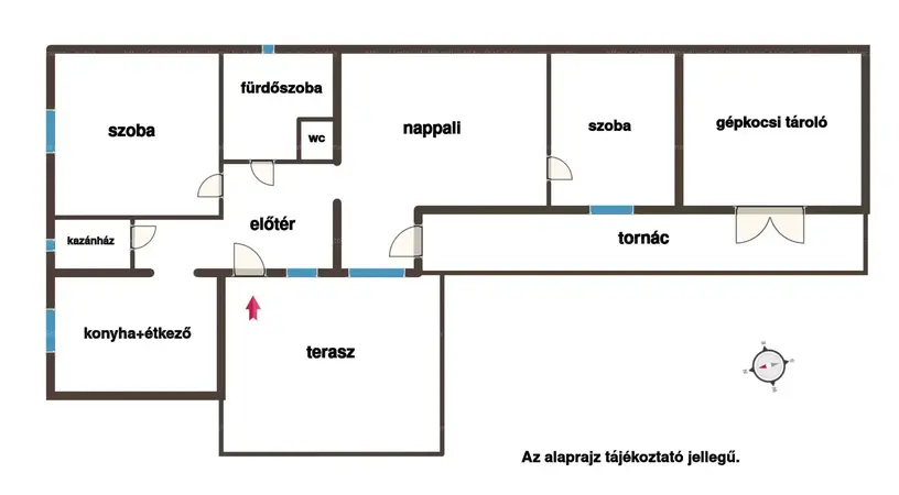 A ház központi részén egy tágas, hangulatos nappali helyezkedik el, melynek plusz értéket egy látványos, vízteres kandalló ad. Ez nem csak esztétikailag, hanem fűtés szempontjából is lényeges, ugyanakkor egyedi nem szokványos megoldás. A nappalin kívül még 2 külön nyíló szoba, egy hatalmas konyha, kamra, előszoba, külön wc és fürdőszoba, garázs és pince helyiségek tartoznak az ingatlanhoz. Az udvaron töltött nyugodt pihenést, a - nappaliból is közvetlen átjárható- tágas terasz teszi lehetővé.