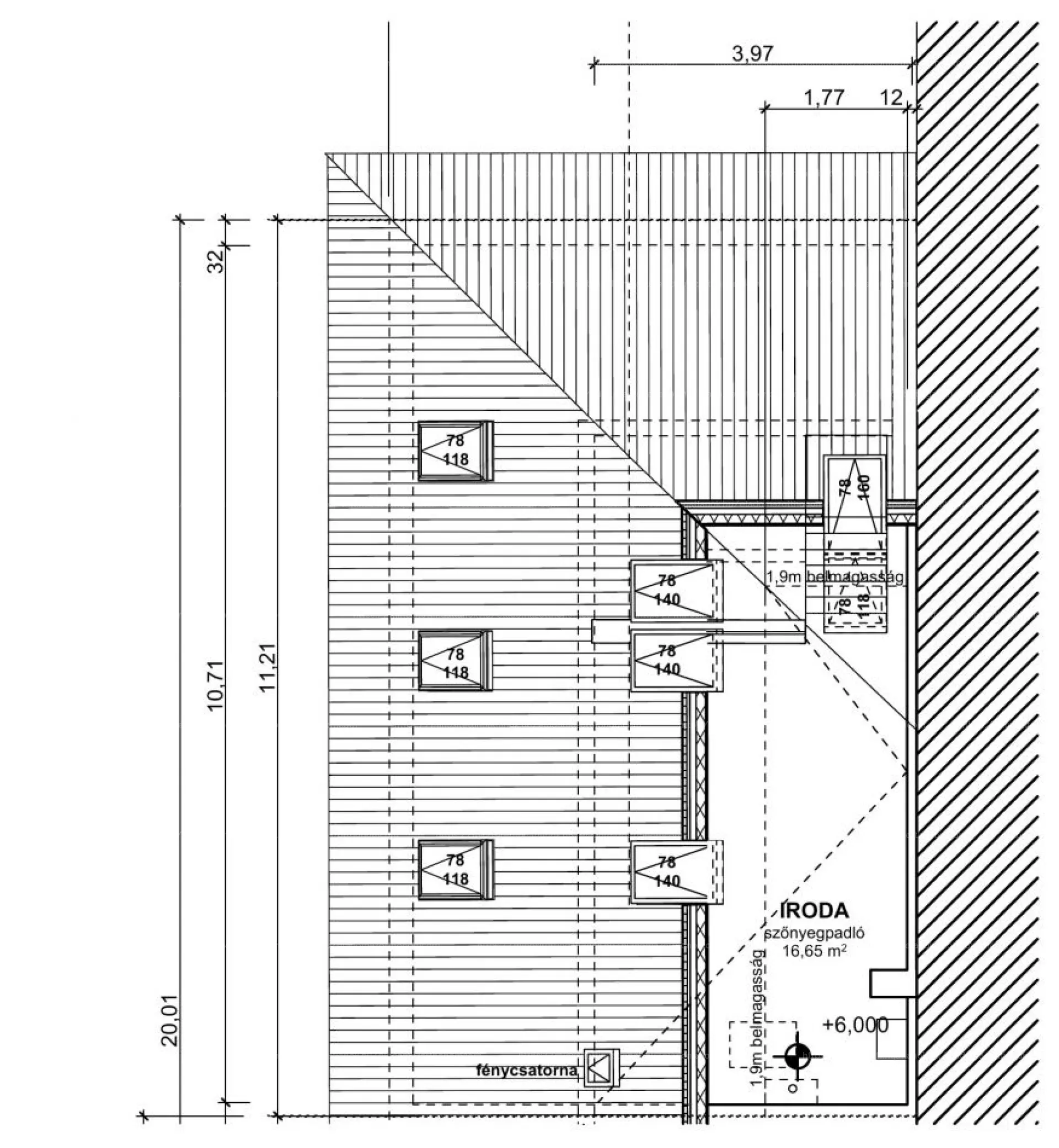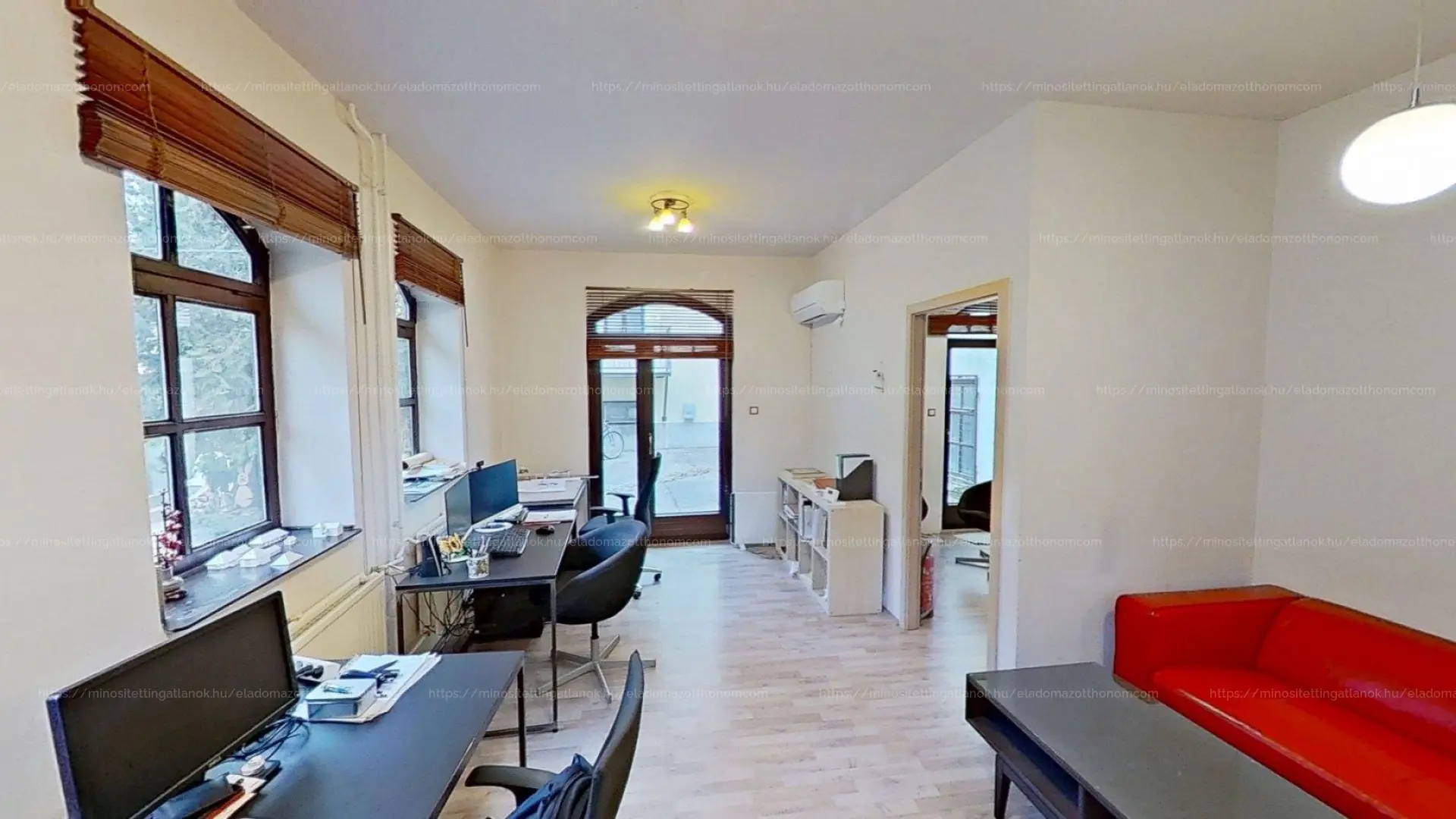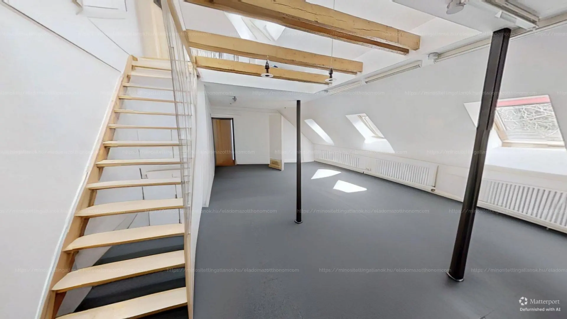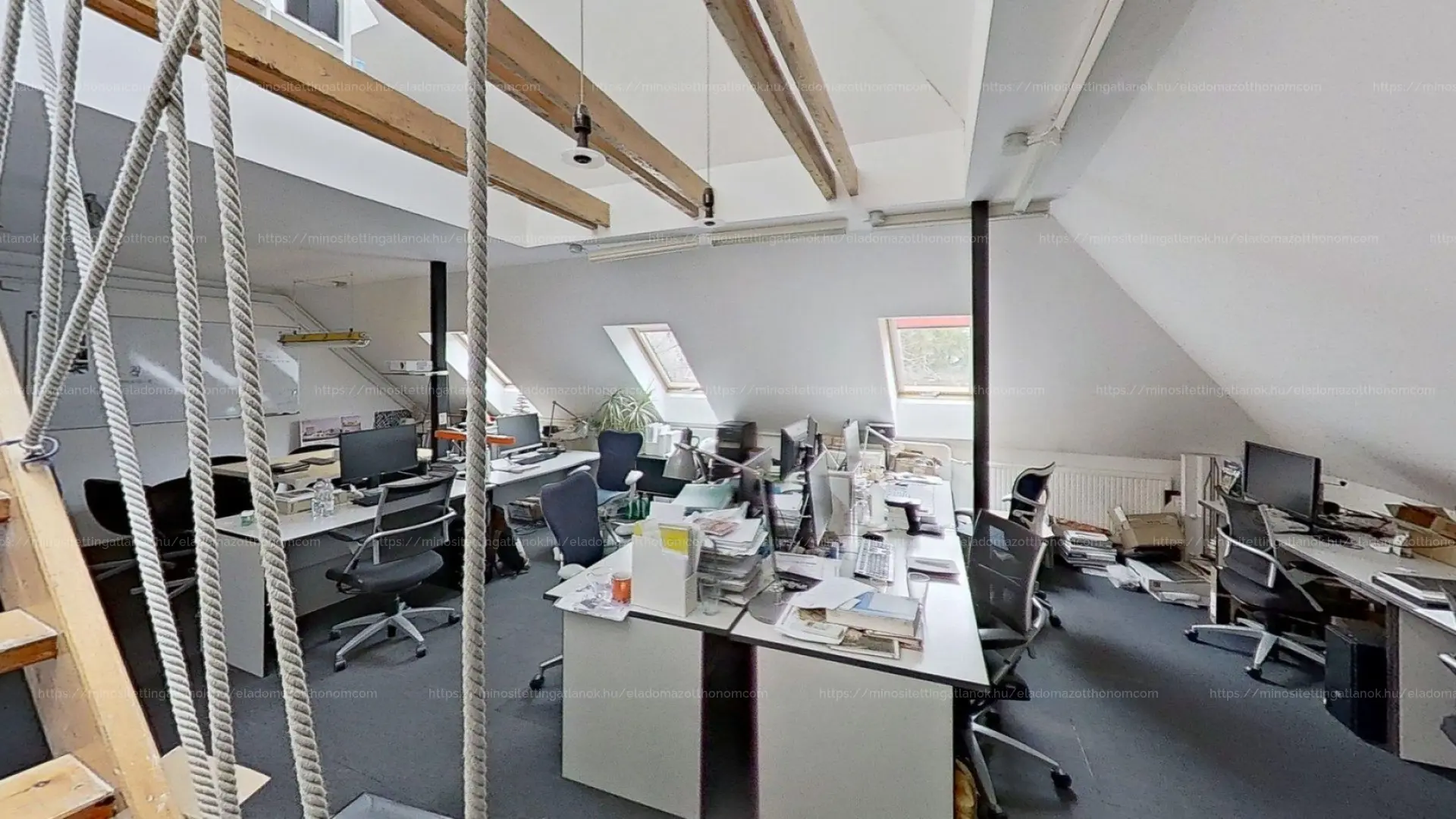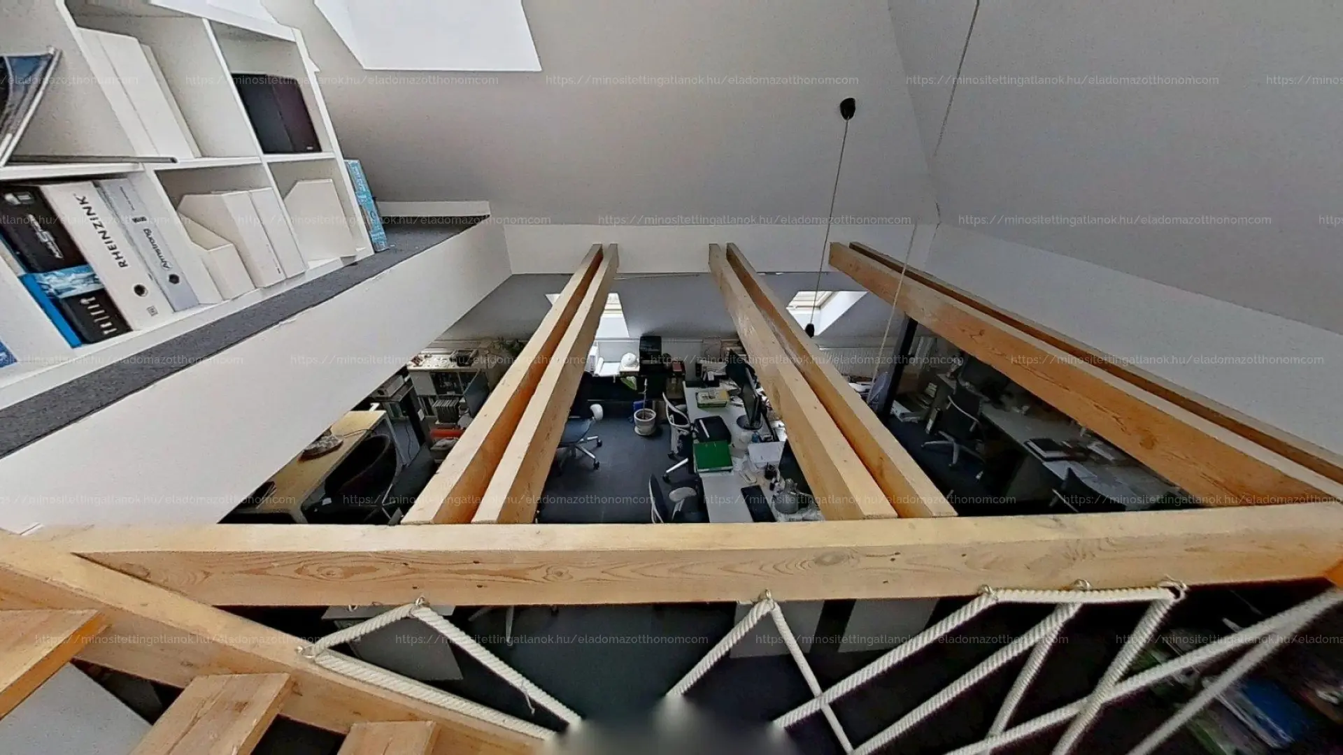 Az előtérből a lépcsőn felfelé indulva találjuk a fenti, nagyobb lakrészt, ahova belépve egy hatalmas, egy légterű, jelenleg irodaként működő helyiségben találjuk magunkat. Ebben a légtérben a tetőtérbe vezető lépcső alatt lett kialakítva egy praktikus kis konyharész. Ebből a légtérből nyílik a fürdő/wc is. Egy szépen kivitelezett fa lépcsőn tudunk a tetőtérbe feljutni, mely akár egy elszeparált külön egység (iroda, háló) is lehet. Ez a felső lakrész is lehetőséget kínál egy önálló lakás kialakítására, a nagy légterű irodarészt akár több szobává is át lehet alakítani.