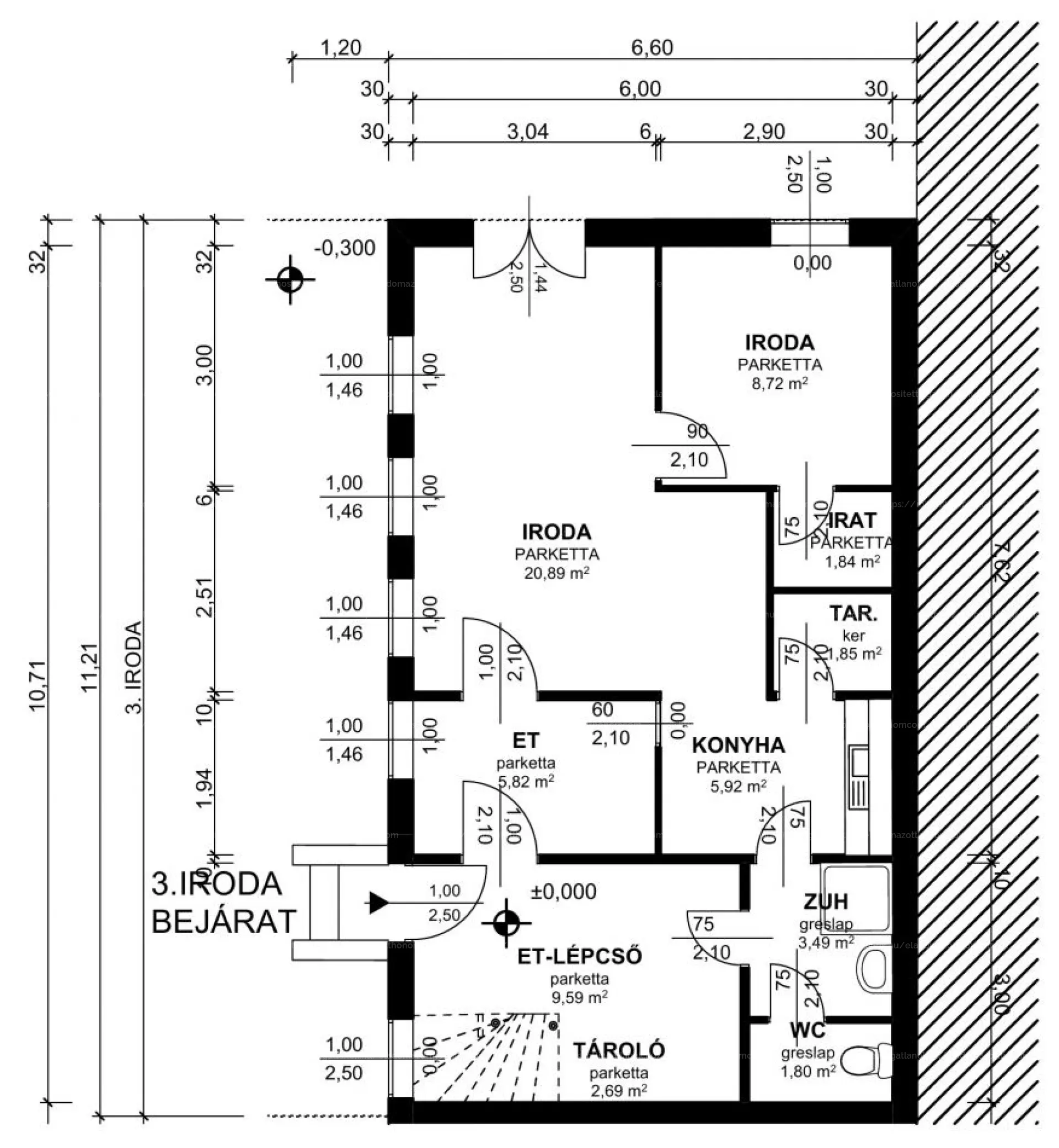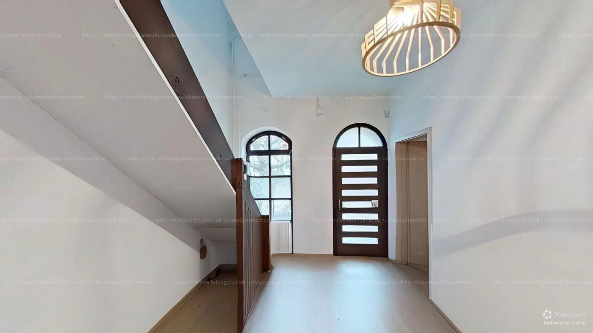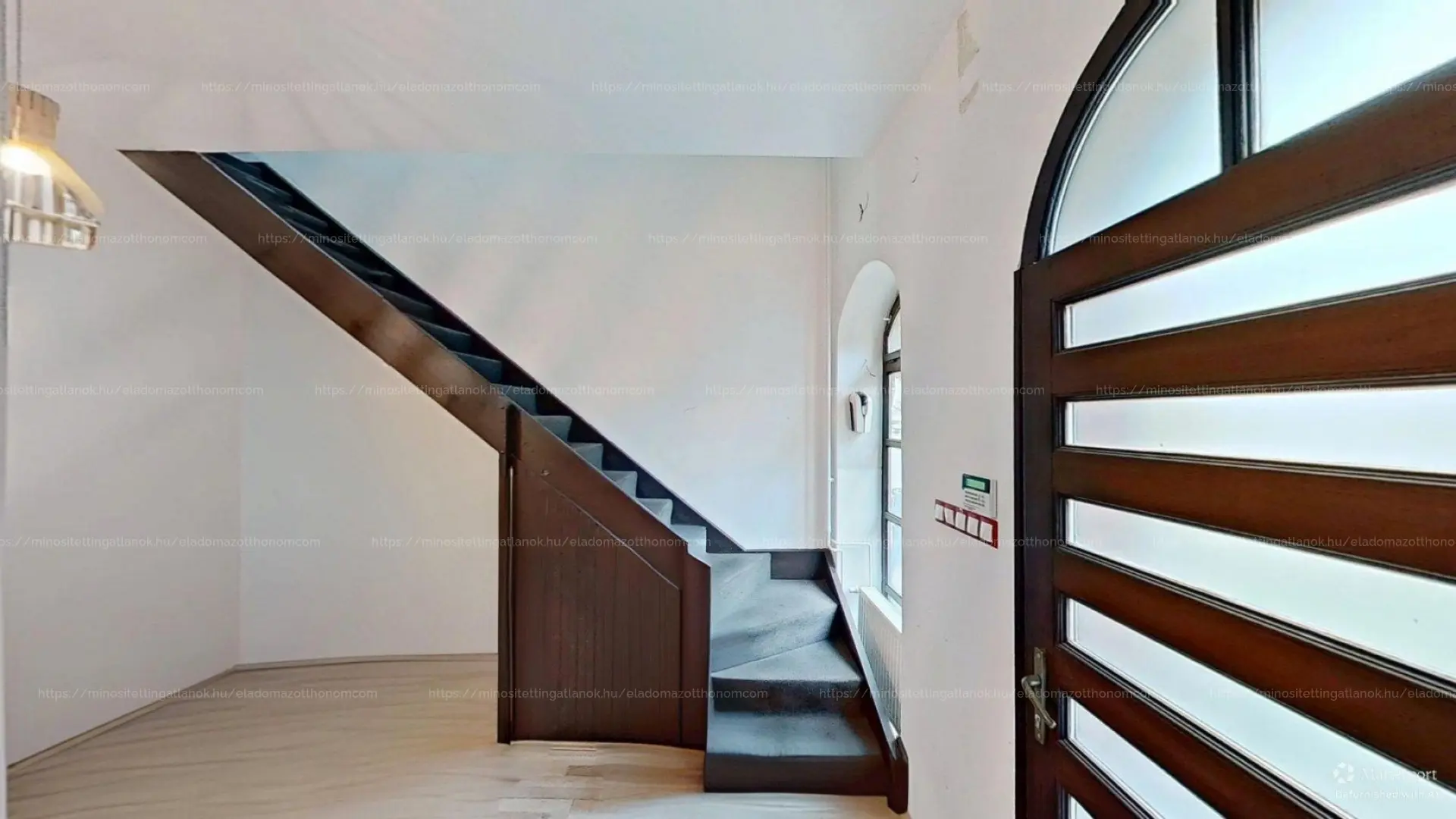 Az ingatlan főbejáratán egy tágas előtérben találjuk magunkat (ez akár váróként is hasznosítható, ha arra szükség lenne). Innen nyílik a földszinti lakrész, valamint egy lépcsőn innen lehet felmenni a felső lakrészbe.