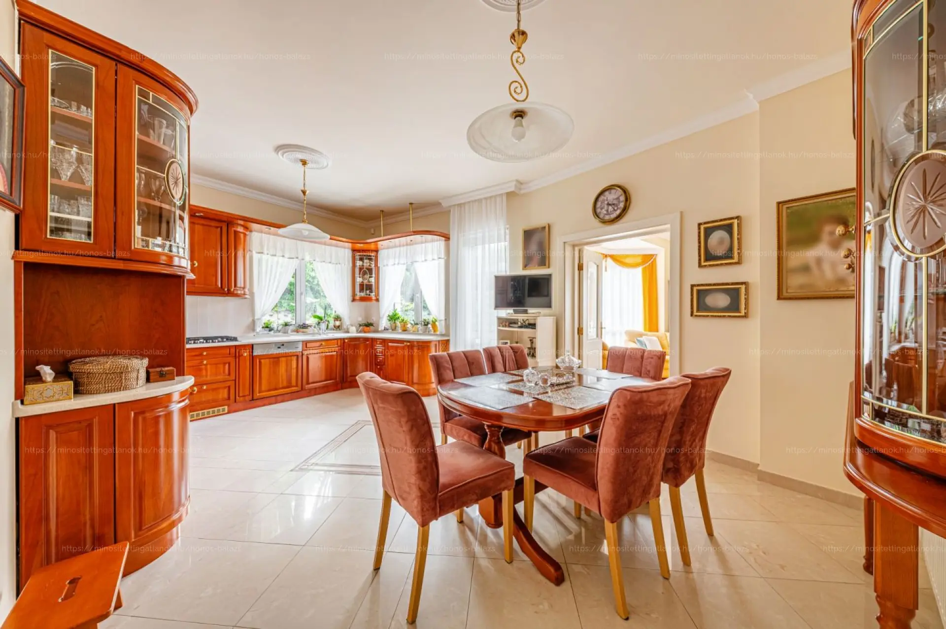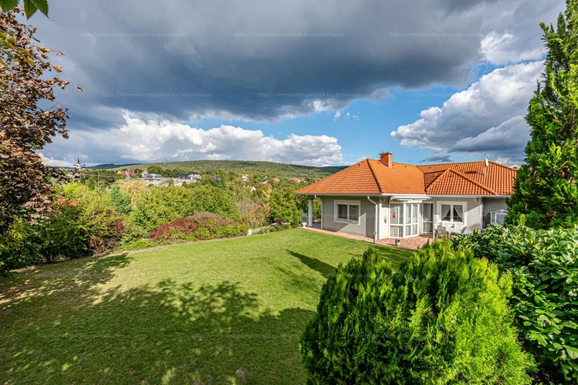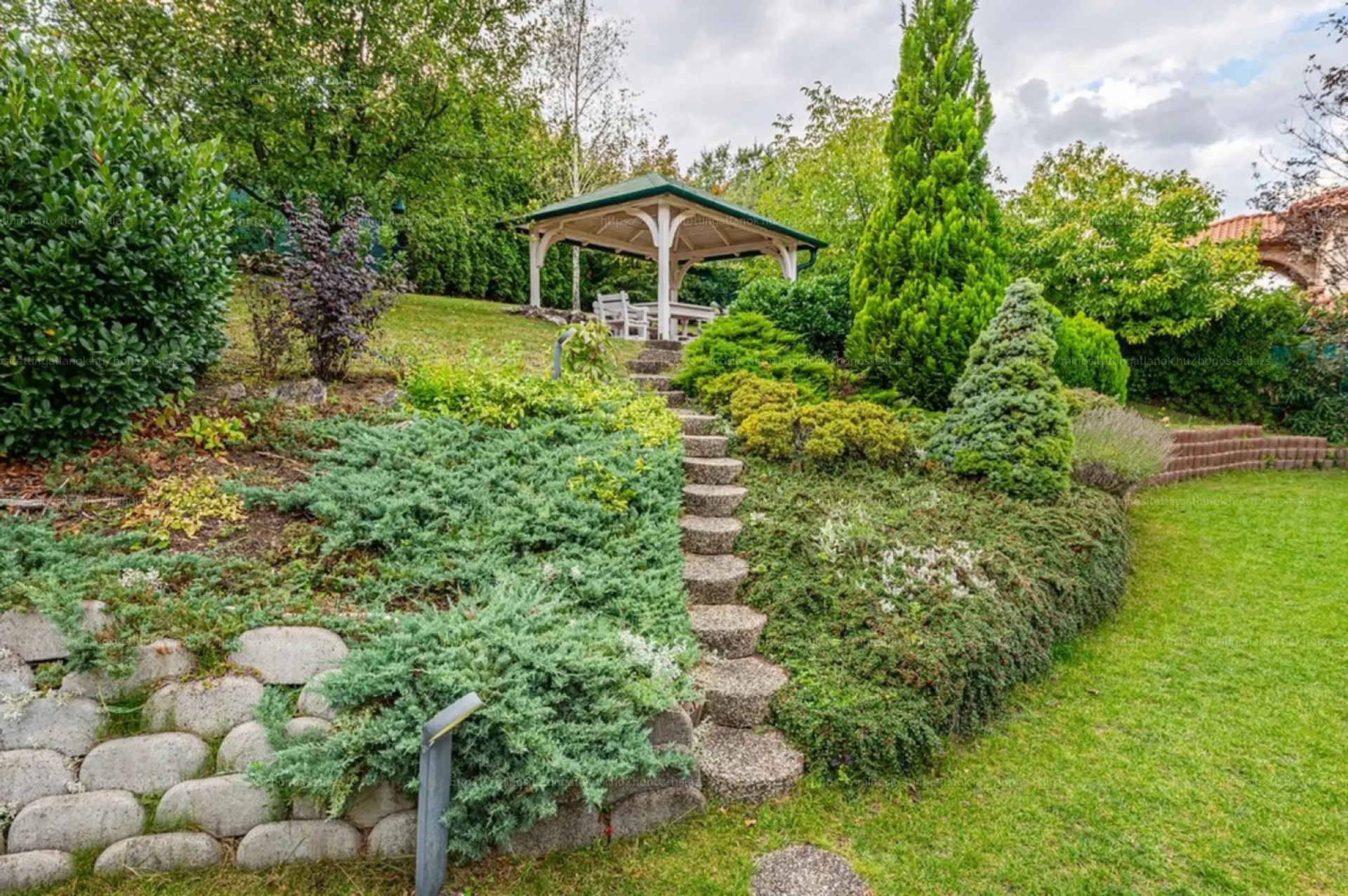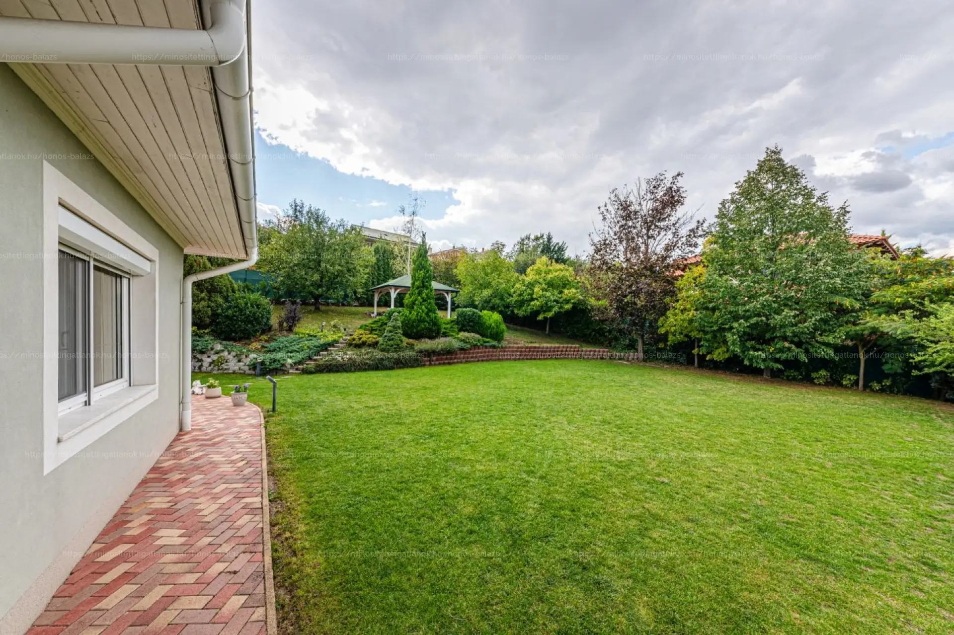 Az 1203 m²-es, sík telek ritka adottságú a környéken. A gondosan tervezett kert gyümölcsfáival, dísznövényeivel és panorámás szaletlivel a pihenés és kikapcsolódás tökéletes helyszíne. A nappaliból nyíló, hatvan négyzetméteres terasz a ház természetes meghosszabbítása, amely ideális helyszínt biztosít családi étkezésekhez vagy nyári estékhez.