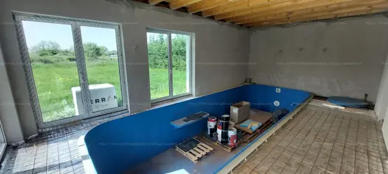 👉 A wellnessrészlegben a fűthető medence (8x3x1,5m) gépészettel (9kw-os hőszivattyú) együtt már beépítésre került, a szauna helye előkészítve