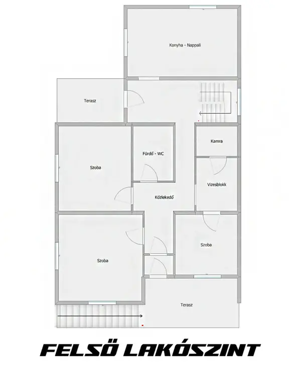 A főbejárat a ház elülső részéről közelíthető meg egy teraszon keresztül, vagy a házon belüli lépcsőházból, ahol egy folyosóról nyíló két nagy hálószoba, egy fürdőszoba, egy praktikus mosókonyha és egy kamra lett kialakítva. A szint végén pedig egy hatalmas, napfényes nappali-konyha fogadja a családi összejöveteleket.
