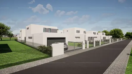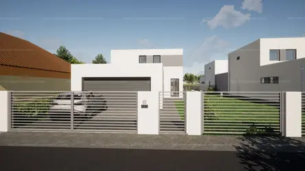 A két lakás egymástól teljesen függetlenül megközelíthető, mert a telek két utcára nyílik, a lakások között elválasztó kerítés épül. A lakásokhoz 1-1 db kétállásos garázs tartozik.