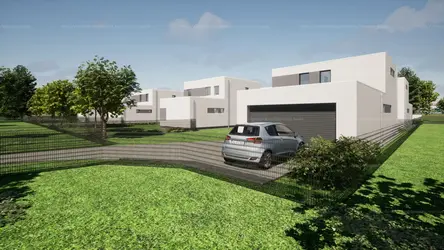A lakóépületek nettó alapterülete lakásonként, garázzsal 150,37 m2, osztatlan közös elkerített telekkel.