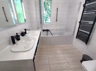 A fürdőszoba ablakos, kád, dupla mosdó, gyönyörű integrált világításos tükör, wc és törülközőszárító található benne.