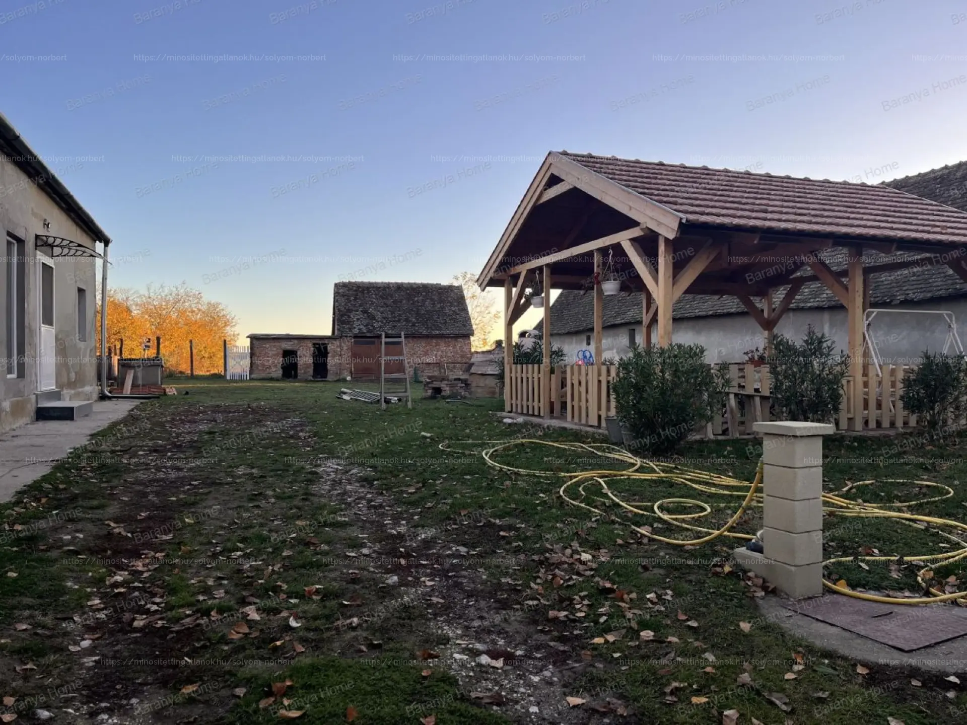 A házhoz egy új, mintegy 30 m²-es, fedett terasz tartozik, cseréptetővel és tégla burkolattal, amely két éve épült. A telken betonozott garázs, valamint több melléképület található: goré, két fából készült tároló és három ól, amelyek jelenleg szintén tárolóként funkcionálnak.